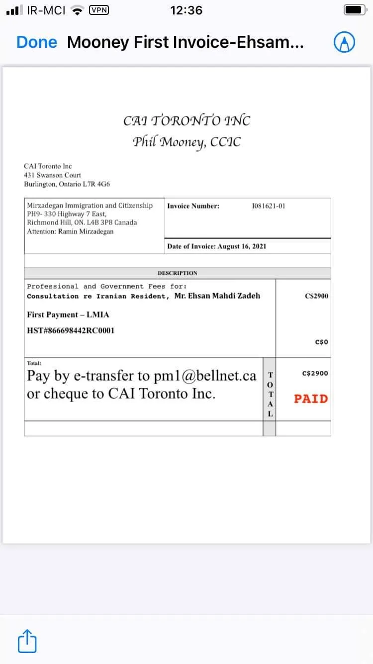 Mobail: 416-399-1998 I have signed an immigration contract for a business investment investment in the amount of C $ 150,000 in Ontario, to which I initially deposited $ 10,000 as a deposit to continue working. I will be offered a job in Coburg Symposium's restaurant for about $ 650,000, which was initially objected to by my initial objection that our contract amount is $ 150. It is a thousand dollars, not this heavy amount, but according to the first lie and deception, they said that you buy the property and the shop with the score of the symposium restaurant and the equipment in full, and they said that this restaurant has a gross annual income of 1,300,000 one million three hundred It's a thousand dollars. I was very surprised, but due to the unreasonable trust I had in him, I told him to send me the report of the restaurant's one-year financial period. Rather, it was made by hand by themselves and the next item to them I said that the amount of 650,000 Canadian dollars should be an official and legal expertise. Heavy rent Why was it added that he insulted and threatened me? You should trust me as an immigration lawyer and during a phone call about 3 months ago he told me because of the busy work of the company that accepts 200 immigration cases every month And 200 cases are rejected because they do not have enough time to process the files. In my case, Mr. Phil Mooney was added to membership R406239 on August 6 to speed up the process. It is not and it has not been registered. Many questions have arisen in my mind that some people like me have caused a lot of problems through this method and have not paid for it. All these words and conversations, especially the documents and documents of the tax evasion certificate. They and the company give and in line with this issue that all fashion The rack is attached to this letter, and since I intend to invest and immigrate, the accuracy of the amounts mentioned must be proven to me. Announce the unreal and the result subsequently to my e-mail. I also have Ehsan Mehdizadeh: