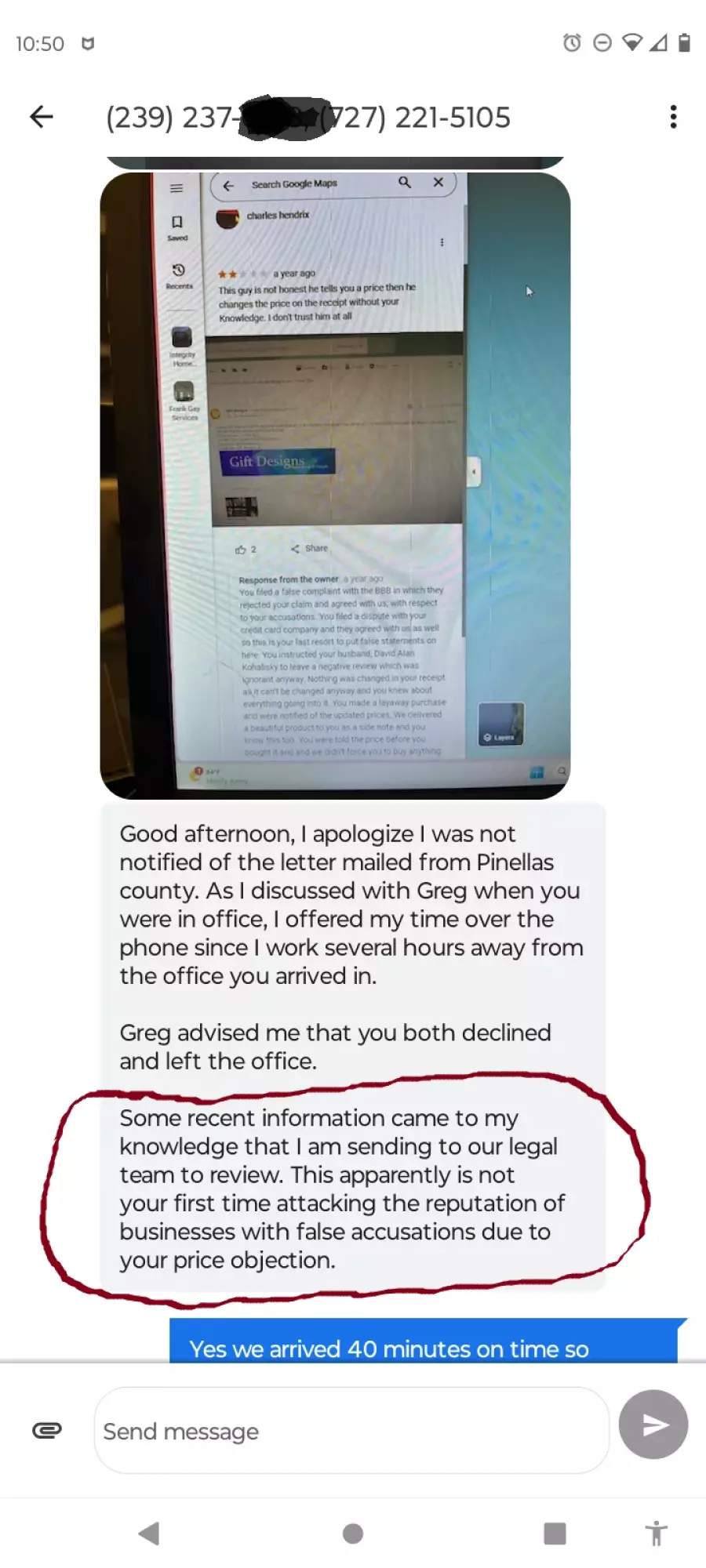 Sorry for the delay in my responseAn appointment has been set up for Thursday 8/24/at 930am for Mr [redacted] to meet with ***, our owner to try to come to an acceptable agreement to end the contract