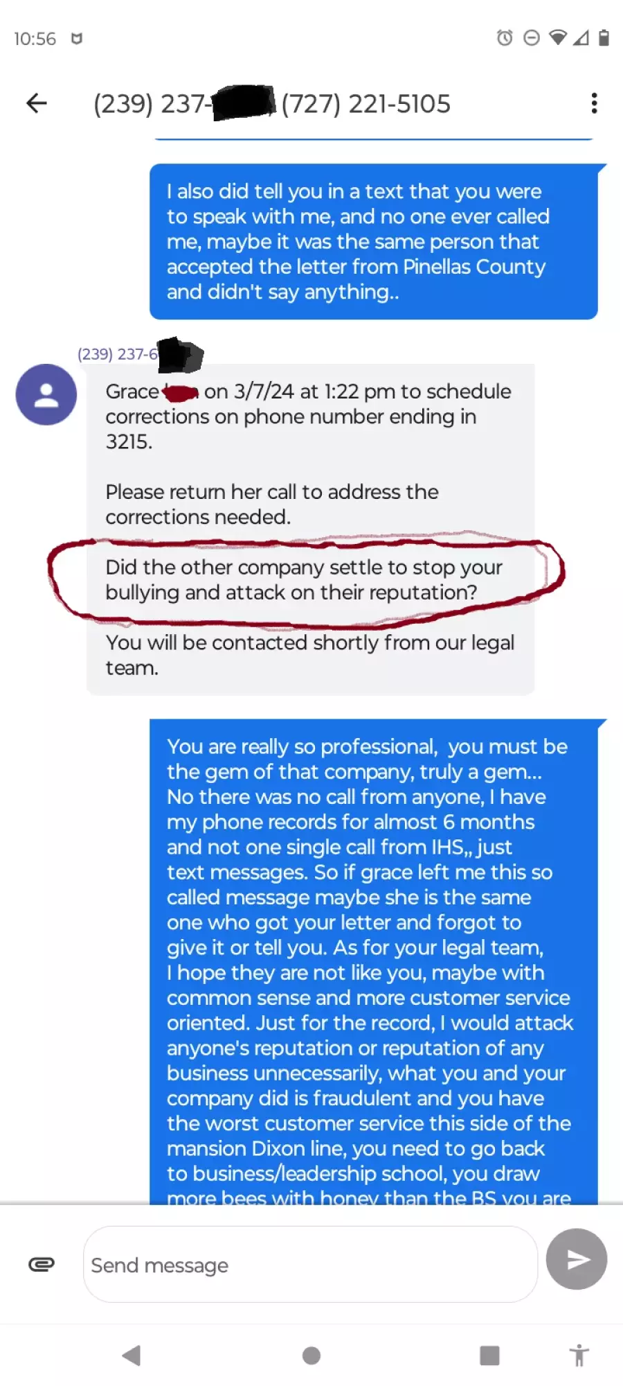 I always allow my partner type out what it is that I want to say when I wish to post a review, I have done several reviews, where we have hired several companies to do work for us, there were two sub-contractors from Home Depot who were installing a new kitchen, did a lot of damage, electrical, granite, cabinets, there was another company "Gift Design". Sarah Cannedy, Manager IHS, went through my reviews and sent pictures of my reviews to my partner and made comments; "this is not your first time attacking the reputation of business with false accusations due to your price objection." "Did the other company settle to stop your bullying and attack on their reputation?" For a lack of a better term, she is saying that I am extorting money from other companies that I post reviews on. Due to the constant harassment for IHS I had to have my home number changed to stop this, my partner not only texted but emailed IHS and Sarah telling her not to call my partner or email him, to deal only with him, and Sarah again emailed me after that demand. Sarah sent a final text " I will not tolerate the demeaning comments and harassment from you or your boyfriend. If Sarah is saying that by my partner calling her a "Liar" is demeaning, well its true, she did lie to him about the banking statement she texted him about and he called her out for it.