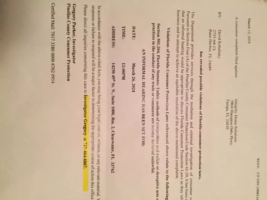 Complaint: [redacted] I am rejecting this response because: Our request was not to 'return down payment' Our request was for Integrity Home Solutions to reimburse us the repair costs incurred, as a result of the direct damage Integrity and its 'workers' caused Additionally, Integrity's response needs to be validated According to current social media accounts, [redacted] is indeed the owner of Integrity Home Solutions Based on their track record, I do not trust that their statement is accurate Sincerely, [redacted]