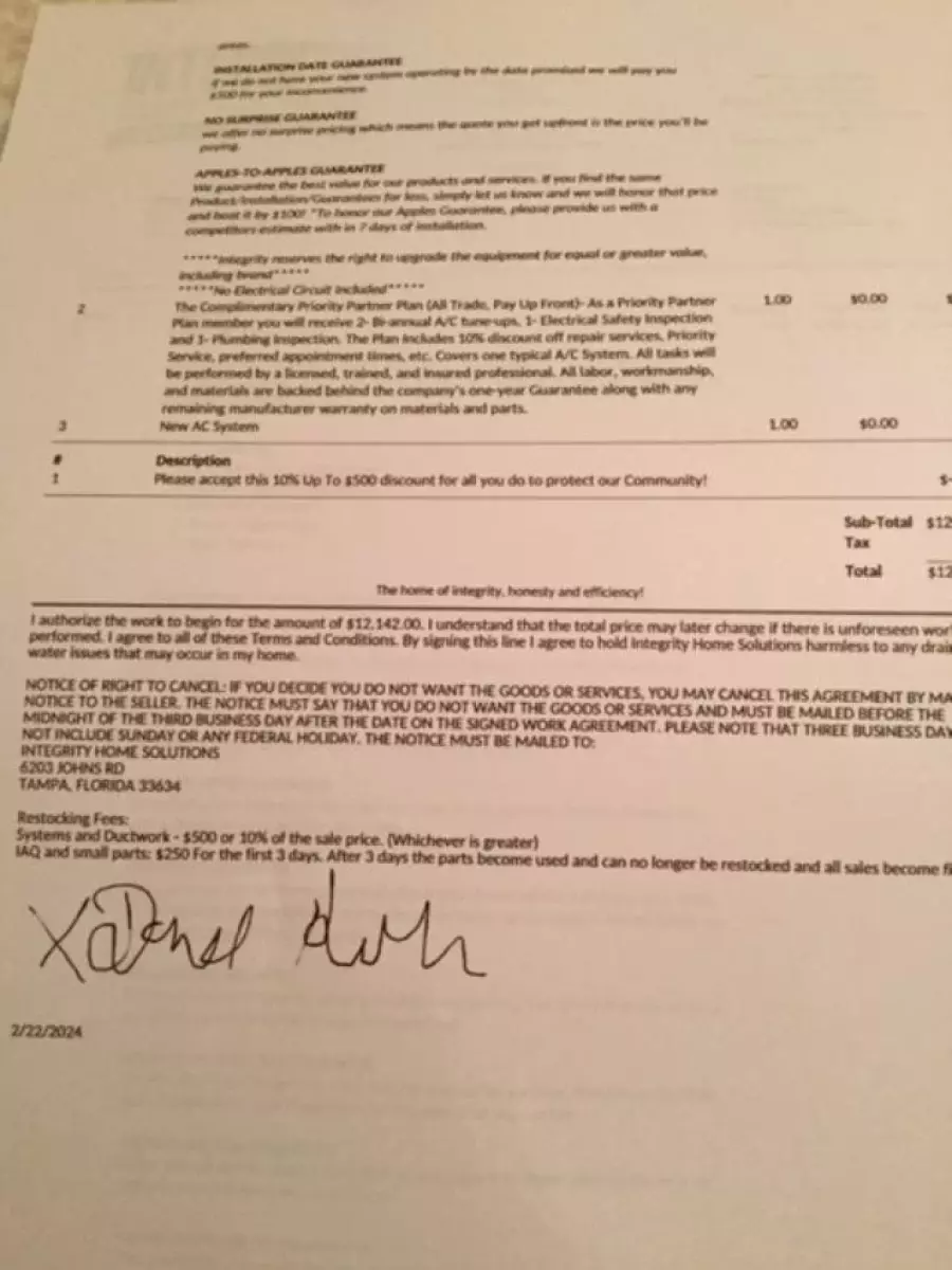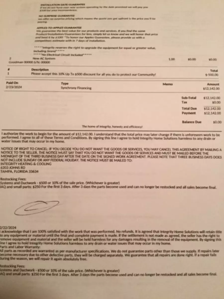I contacted a company named, Integrity Home Soulutions (IHS), they came out on a call for my air conditioning unit on 2/2/24 nothing was wrong and charged a service fee. Our unit wasn't working we called, they came out, the unit was in need or replacing. In the middle of things, Charlie was dealing with IHS at the same time he was on a teleconference with my doctor. Charles had spoken with my me, on the phone, who was at work, he was told that he could sign my name for a credit application, IHS handed him his iPad and said "here, sign the credit application" Charles told him that he could not see the information on the iPad as he have an eye impairment, he took the iPad , made an "X" and said "sign here" which he did, (my doctor who was on the phone with me at the same time, confirmed what IHS said), so my question is this; How is it that this company use trickery to have me sign a credit application when it was truly IHS "contract" and not the credit application as IHS stated that he was signing and again, a doctor hear the conversation and confirms what he was told he was signing a credit application. We were told that installation would be 3 to 4 days out, this would have given us time to talk things out and decide the course of action as all we were authorizing was a credit application, after I was told they could install today, by the time my partner came home they were almost done with the installation.