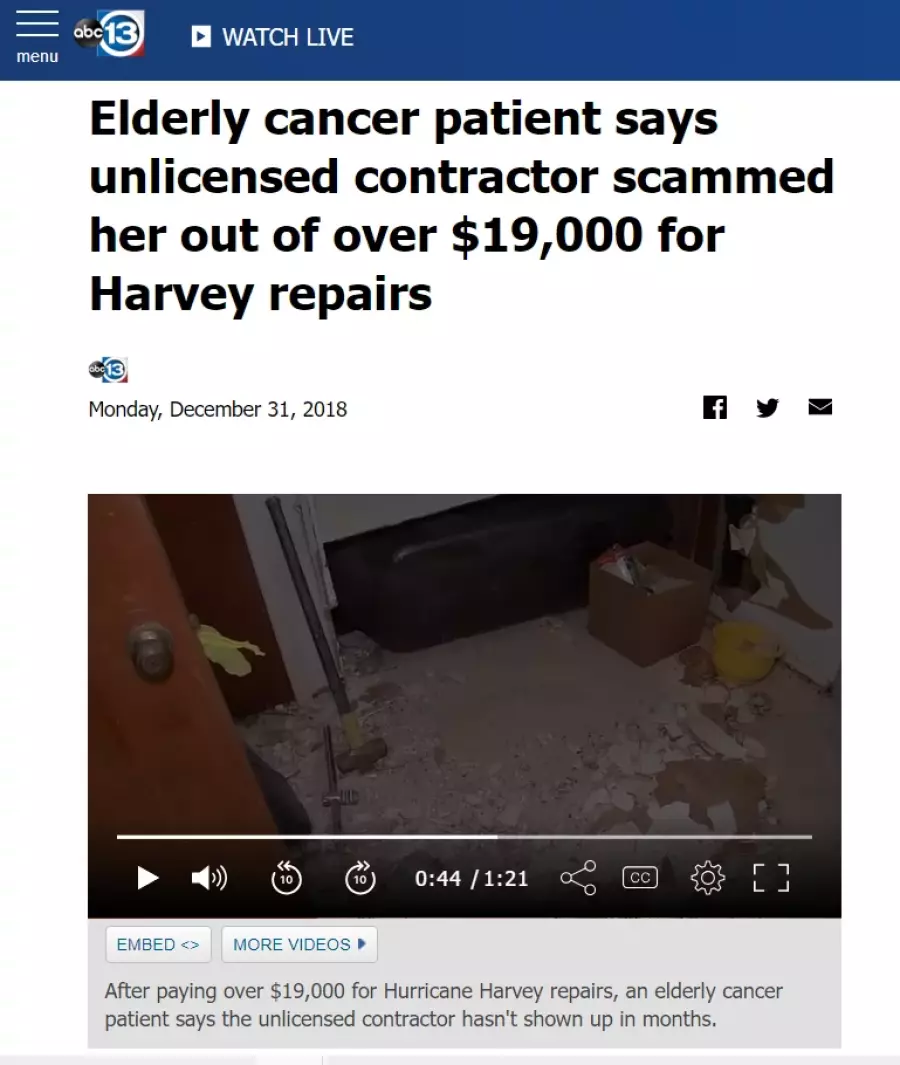 Our hero's journey truly begins around New Year's 2019, when he made the news ( https://abc13.com/scammed-by-contractor-hurricane-harvey-pods-repossessed/499681...⇄ ) for not only scamming a woman with terminal cancer out of $19,000 but demolishing the elderly woman's home in the process. A modest man, Kelvin caught wind of the story before it aired and tried to stay nameless.