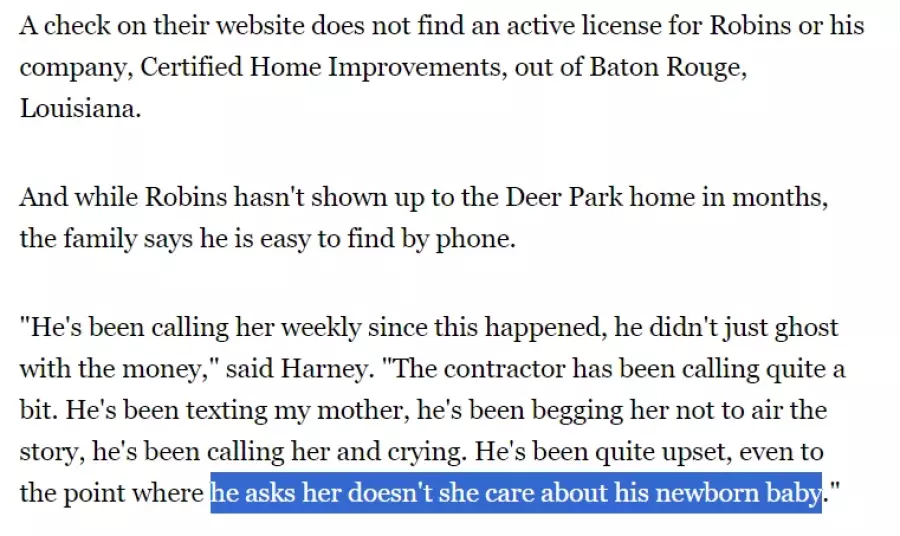 You can find out everything you what Kelvin Hayes Robins Jr. is by just searching for his name. One of the first results is an article from New Year's 2019 about him scamming a woman with terminal cancer out of $19,000 and leaving her house demolished [ https://abc13.com/scammed-by-contractor-hurricane-harvey-pods-repossessed/499681...⇄ ] . However, this article does not tell the full story. Searching for his full name will also tell you how he abandoned that baby he kept emotionally blackmailing a dying cancer patient with [ https://archive.ph/NY238#selection-2855.0-2855.19 , https://archive.is/FT1RZ/d9235bda20c9fb0603cc05c79d30b2883144a04b.webp https://archive.is/FT1RZ/210eee3cb8ee1c15a677a774812aa9c8a7500d4b.webp https://archive.is/FT1RZ/75ab58df38004a3ce57bce79ab4fef9596f4bac5.webp ] . You will also learn that, despite his claims of poverty when he demands advance payment from the old and sick [ https://archive.is/x4b2i#selection-1473.1-1482.0 ], he and his partner, Johnny Lee Tolliver, have posted pictures on their social media showing off: