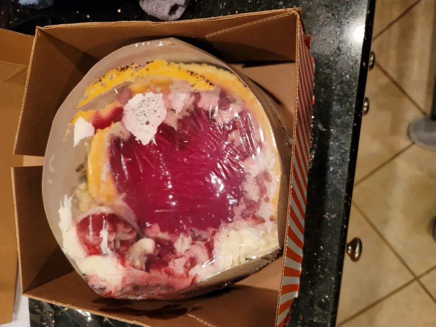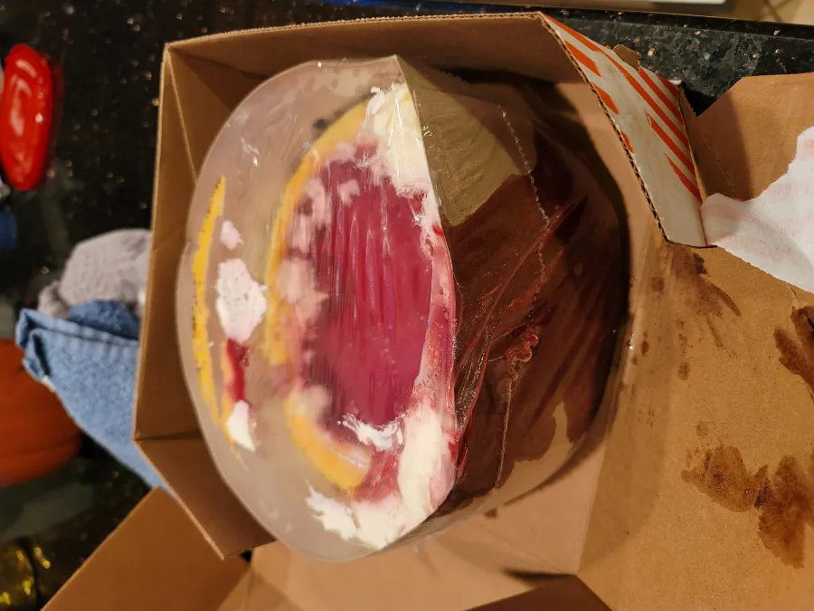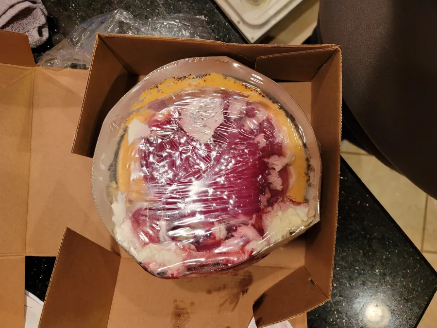 I ordered a Brownie cheesecake for my Mom for her birthday, and a white chocolate raspberry cheesecake for my boyfriend for Fathers day. Of course compliments to UPS both orders were delivered late, they looked as if they had been dropped, and were just totally unacceptable. I spent $130.00 on two cheesecakes that ended up in the trash because when they got here there was no dry ice and they were hot and melted. This is supposed to be the white chocolate raspberry...I've submitted a complaint I just hope that department is better than the delivery...