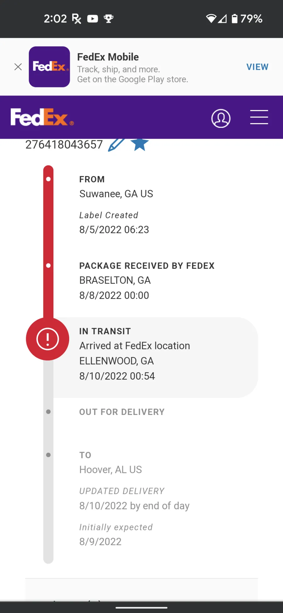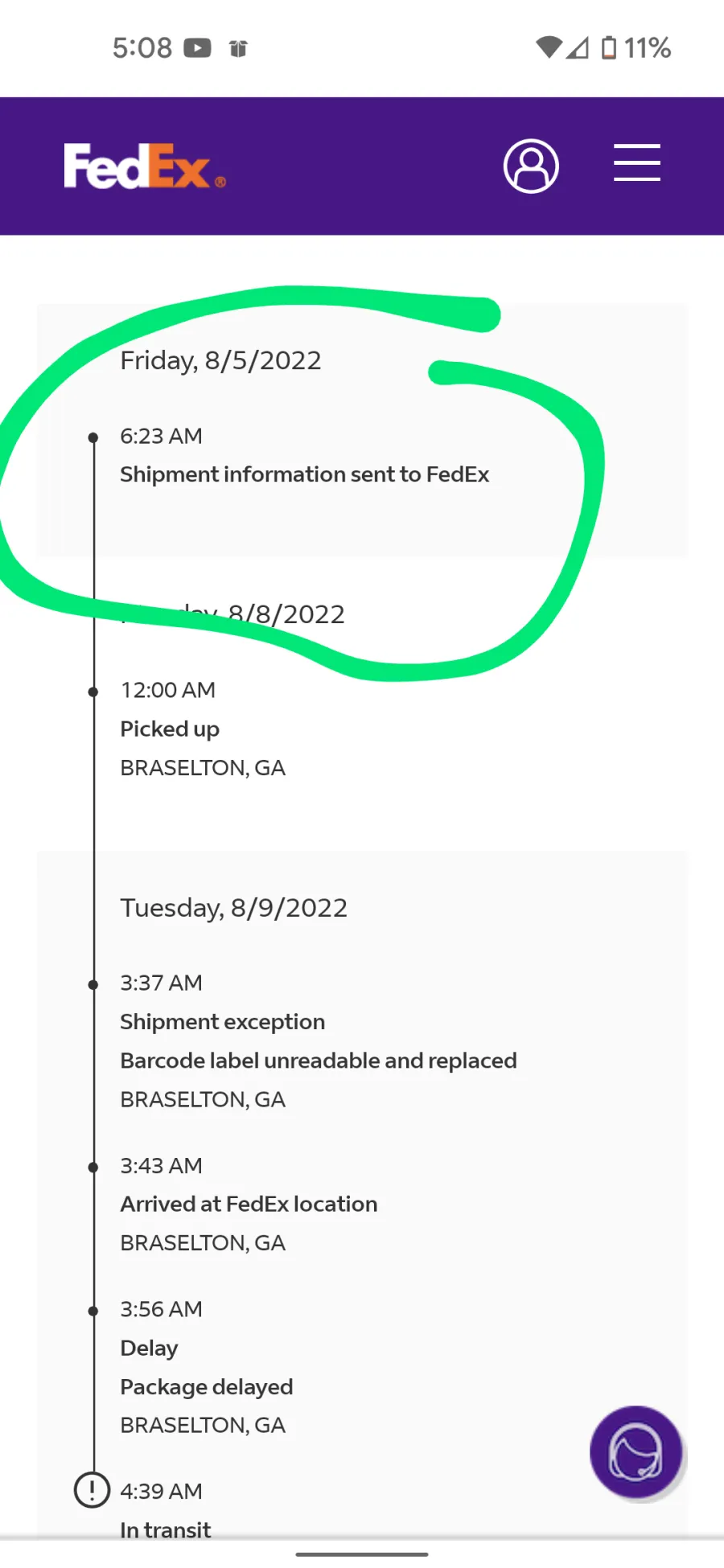 I upload the wrong FedEx pic the original shows pickup on 8/5 at 6:23am, this one was from yesterday but as of today it hasn't left.