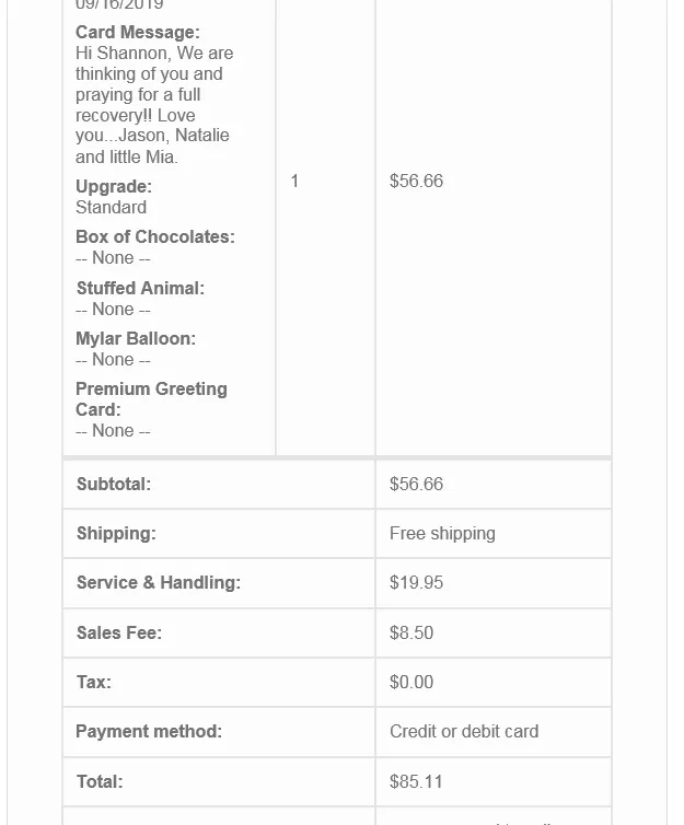 The is a scam greasy loser business. I ordered flowers for a friend who was severely injured in a crash. I ordered from a Canadian website, from a Canadian city to a Canadian City. I ordered a $56.66 bouquet, they added service fees and sales fee for a total of $85.11. I was charged over $120.00 on my credit card. They said all of their prices are in USA funds.