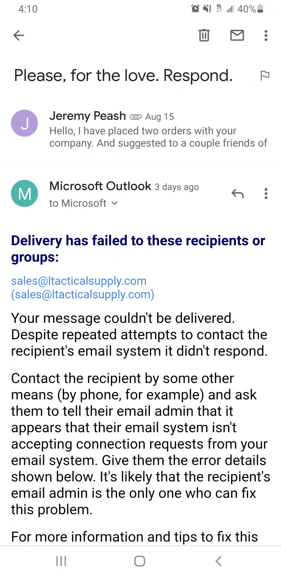 Days later no response. So then I sent a email. Which bounced back saying the email could not be delivered.