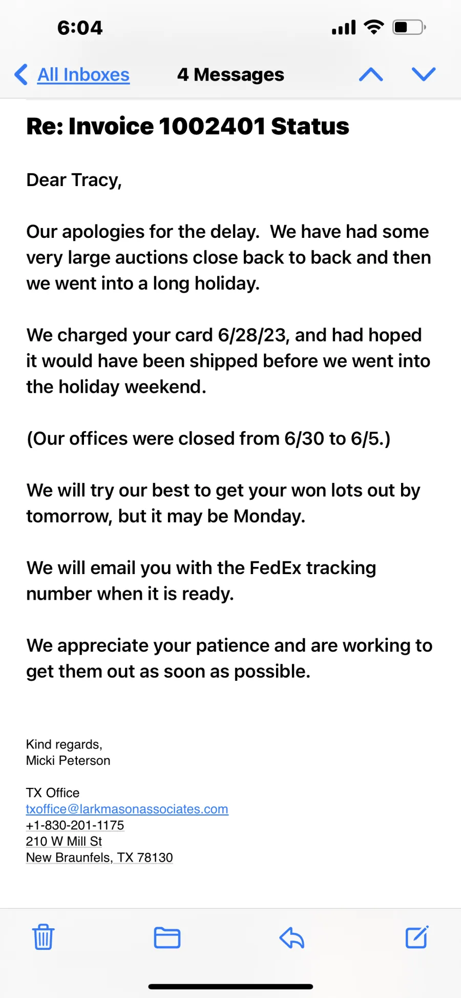 I sent an email to Lark Mason and their reply was that they are busy and then were out for holiday. They promised my order would ship no later than Monday - today is Thursday. I sent a follow up email on Monday and Tuesday but no reply. I did tell them that if I don’t have the product by Saturday (a week after they promised and almost a month after the auction ended) I am going to dispute the charge.