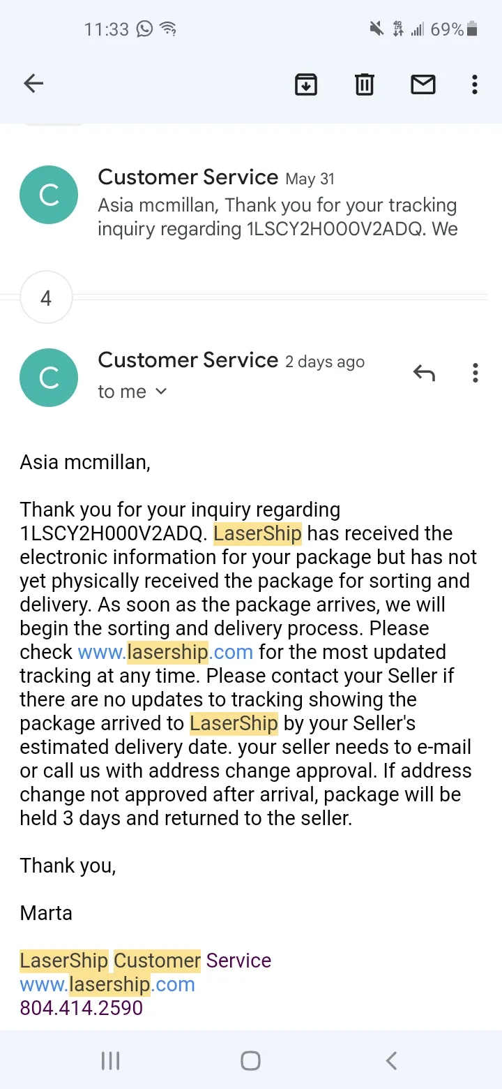 This company should not be in business. First time I've ever even heard of this delivery service and they happen to have been delivering my order at the time. I got a notification via Walmart (the place where I ordered from) saying that they delivered my package and so I go out to look for it and it's nowhere to be found. I contacted LaserShip and sent in a complaint about my missing package, and they never got back to me. I then had to go through the trouble of contacting Walmart to replace my lost items only to find out they could only reship some of them and refund me for the rest. I was not happy about this. I got curious and googled reviews for LaserShip and found out that a lot of people do NOT like this delivery company and I can see why.
