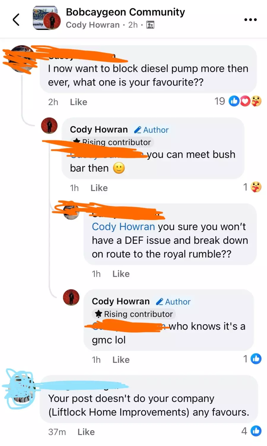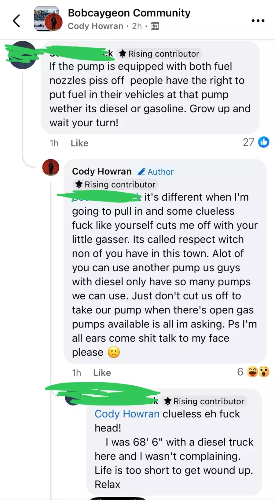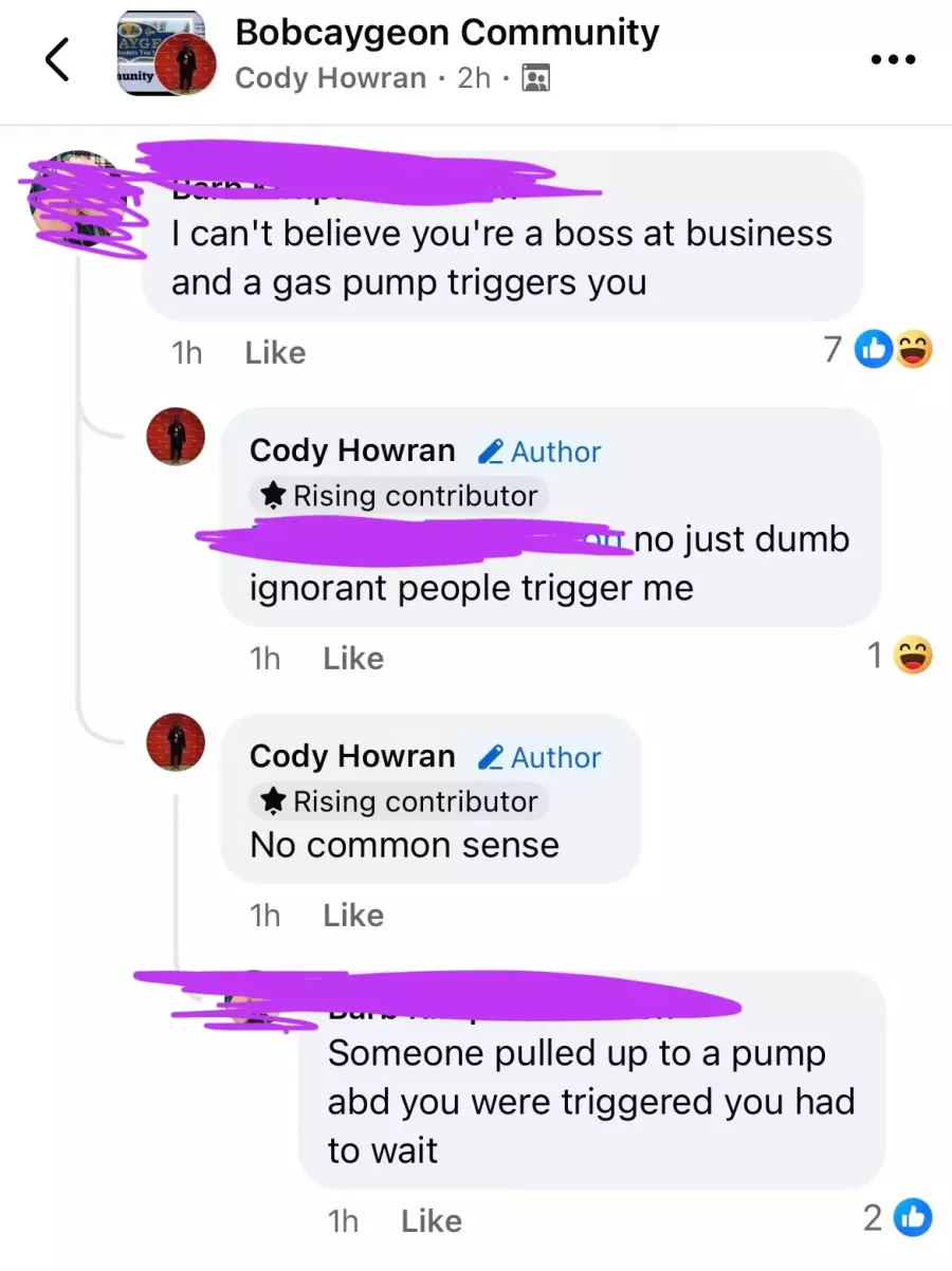 Not only did Cody see it fit to air this complaint with the entire community of Bobcaygeon, but he resorted to aggressive retaliatory remarks when respected members of the community chose to challenge his views. This disproportionately escalated to Cody stating that he was actively purchasing a bush bar for his truck with the intent of causing grievous injury and property damage to vehicle owners and their vehicles for using “his” gas pump. He also, for an unknown reason, deemed it appropriate to threaten/yell at (by his definition) an “old woman” should she ever prohibit his ability to pump gas.