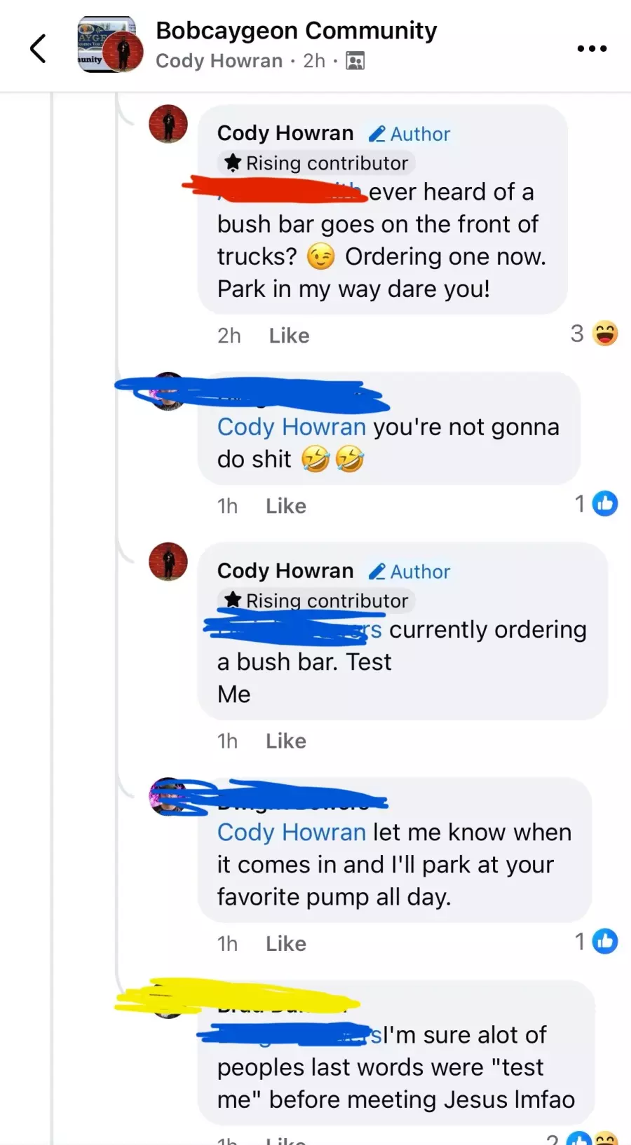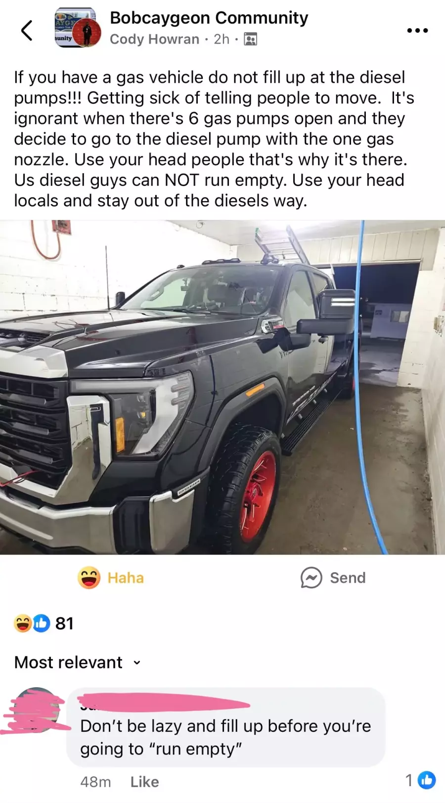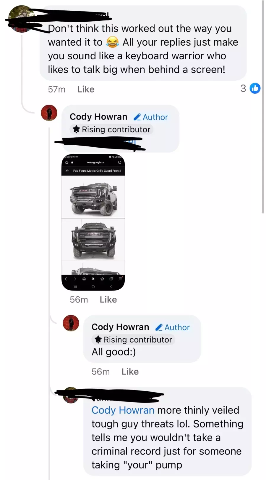 Not only did Cody see it fit to air this complaint with the entire community of Bobcaygeon, but he resorted to aggressive retaliatory remarks when respected members of the community chose to challenge his views. This disproportionately escalated to Cody stating that he was actively purchasing a bush bar for his truck with the intent of causing grievous injury and property damage to vehicle owners and their vehicles for using “his” gas pump. He also, for an unknown reason, deemed it appropriate to threaten/yell at (by his definition) an “old woman” should she ever prohibit his ability to pump gas.