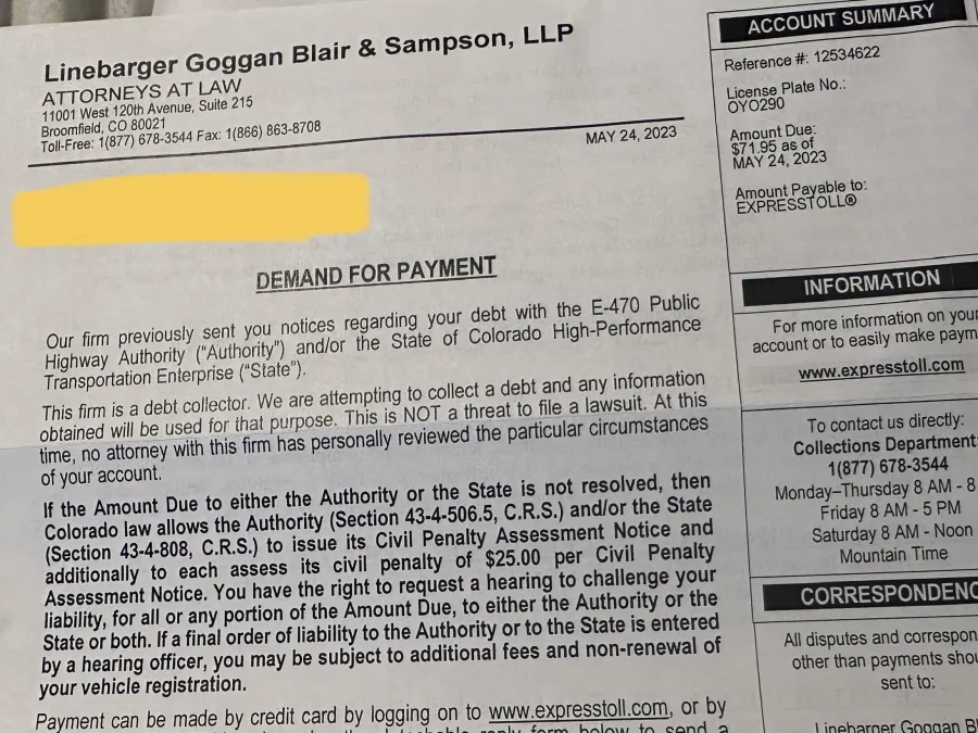 E-470. The E-470 review of the vehicle image from the toll indicated a plate