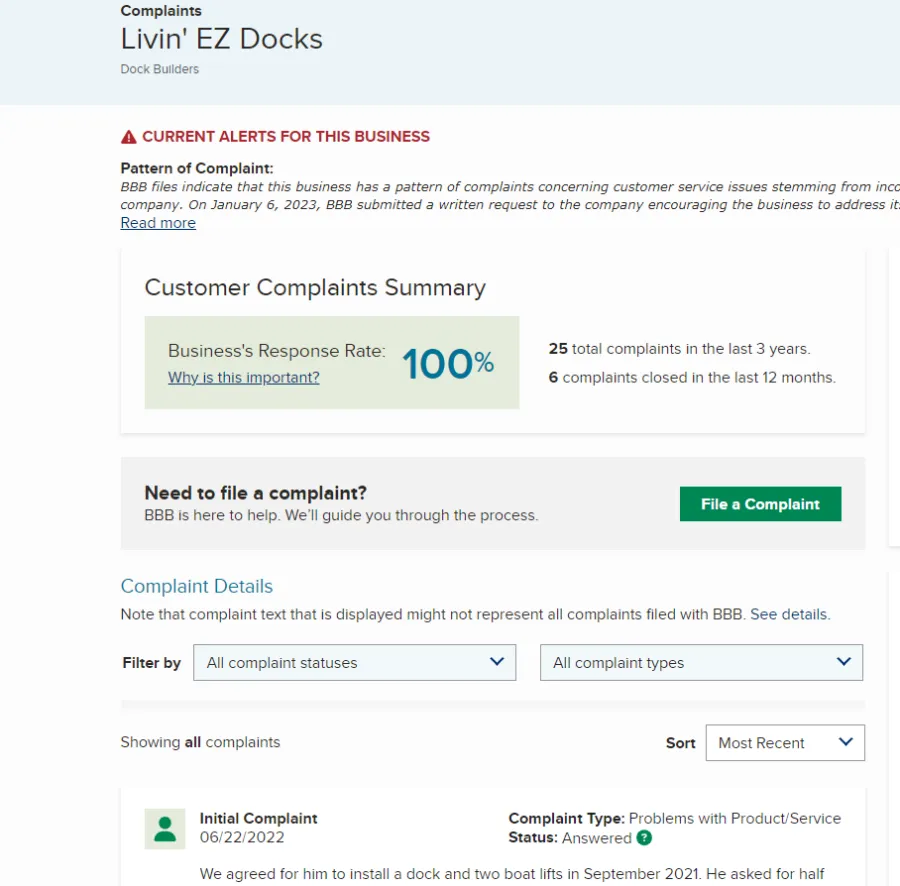 I have reviewed the response made by the business in reference to complaint ID [redacted]. When the lake level increases, we have been promised that the old dock will be removed. Once our old dock is removed from the area, we will be completely satisfied. It took an additional 3 months to complete the work that the business was contractually obligated to completed by May 31st, 2015. We appreciate that Neil (Business owner's brother) stepped up to the plate. He facilitated the completion of the dock, boat lift, PWC lift and walkway. He also answered calls and returned txt msgs. Best regards,[redacted]