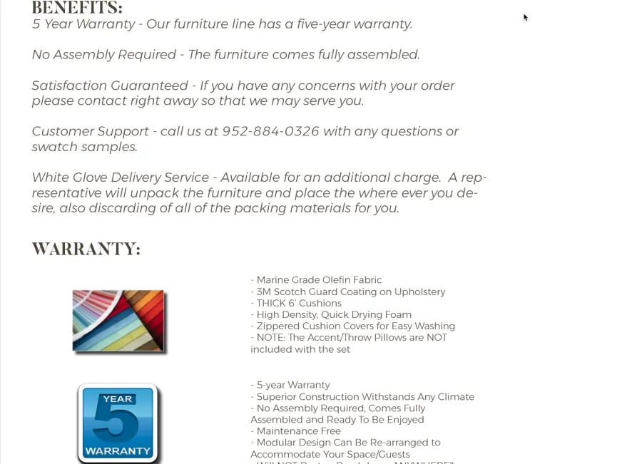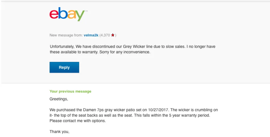 We purchased a 7 piece patio set and furniture covers from M & E Sales on their EBAY site. The item description states that the items come with a 5 year warranty and they also allege that the product can withstand "the harshest of conditions...". After (2) years, the chairs are falling apart, wicker is cracking and brittle. We called several times without a response. We emailed the company and they stated "We no longer carry the item due to slow sales, so we will not warranty it...". When I spoke to Jarod in customer service he told me that we apparently didn't cover the items well enough then told me that he would not cover it, but that he would tell the owner about the problem. I told him that based on the 10 complaints at BBB (with the same issue), that it would be in their best interest to resolve this, he stated (condescending) that the company handles thousands of orders, so 10 complaints is no big deal. Unfortunately it is if it happens to you. To date they refuse to acknowledge, honor and pay or make the situation right, looks like we are going to court. Buyer beware, stay clear of this company because if you have an issue, you will need to sue to get resolution.