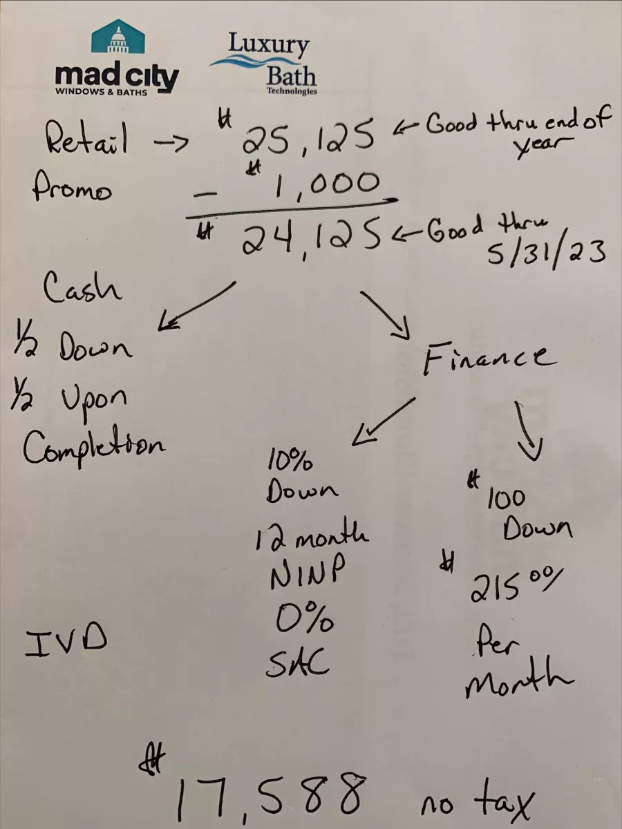 Upon further review of product, the shower base installed did not match size (front to back) that was detailed with a dimension and shown by salesman. I did sign a job sheet that was provided by a person that reviews space available details for shower base. However, I was not informed that new size would be smaller, it was up to me to note a change. Mad City reps will tell you "Satisfaction Guaranteed", but beware, unless you read and double check all documents that you are signing you may end up with product issues that will not be resolved to your satisfaction. Mad City should assure you fully understand what you are told up-front is not necessarily what you get.