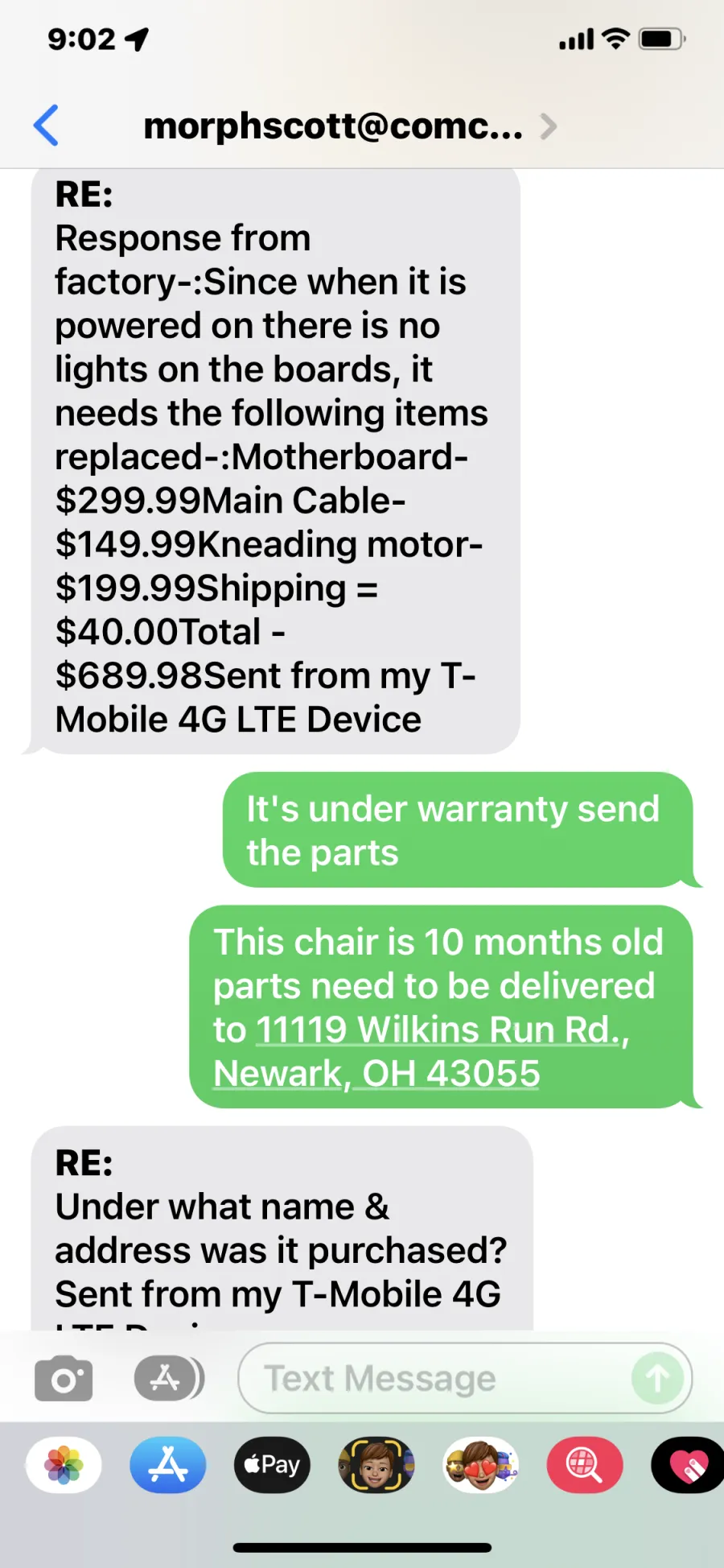 From 12/29/2018 to 4/23/2019, he has held my $4,499.98 hostage, and I have had zero massages. I HAVE had to leave work early, repeatedly, to have technicians come to my house to, unsuccessfully, try to repair the chairs.