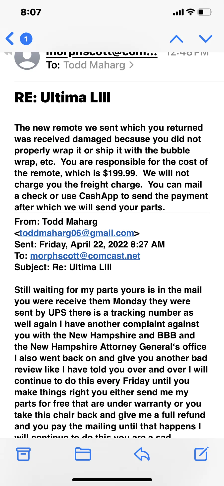 This customer, ***, has been a very difficult, arrogant & belligerent customer in everyone of his communications with us since his massage chair purchase. We have tried to accommodate him in every way often at great and unnecessary expense to us. He refused 2 shipments of his massage chair because the boxes were dirty and had a small ear in them with no damage internally. This was totally unnecessary and cost us nearly $2,000.00 to accommodate him. He told us he was throwing away his massage chair and buying another one elsewhere months ago. Months after he was supposed to have disposed of it, as he had threatened to do, he then contacts us without pics or video, as required, for service. He only explained the symptoms and problem. We told him based on his information it most likely was caused by him having kept his chair plugged in and turned on 24/7 without a surge protector. The damage caused can require the need to replace the power board, motherboard and remote. He elected to buy these parts from us. We sent them promptly and he says he installed them. We have no knowledge or proof that he did so, or that it was done properly as he has not sent us video or pics, or any type of proof as required. Now months later after receiving the parts he is trying to once again get a free lunch, which has been his prior M.O. We do not guarantee that when someone buys a part that it will solve his problem, although we do make best effort to fix the problem, nor do we provide a refund for parts that are used and installed as he is requesting. We have written proof of all his bullying and belligerent and arrogant and threatening emails. Due to his constantly crying wolf in the past we do not believe what he says without pics, videos and written proof, which he has repeatedly failed to provide us. We have not done anything wrong. This customer is beyond difficult and unreasonable. We have elected to not respond to his threatening, arrogant, bullying and abusive emails. He has never even tried to deal with us on a professional level. Sadly we believe that no matter what someone does, they could not satisfy this customer.