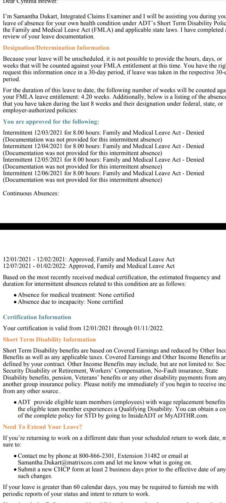 Thank you for contacting Matrix regarding this matter While we are never pleased to see that a claimant is unhappy with our services, we do greatly appreciate a chance to clarify this matter for our claimants Ms [redacted] originally filed a claim for leave of absence for the period of 02/19/14-04/01/ As part of this claim she was required to provide Matrix with the necessary paperwork for her claim to be approved This paperwork was received on 03/13/and her FMLA claim was approved the very same day In addition to filing an FMLA claim, Ms [redacted] is also eligible to apply for short-term disability benefits These benefits would begin after she has been out of work for continuous days In order to receive short-term disability benefits, the claimant must provide the necessary medical documentation to support their claim for benefits In this case, the medical certification form which was provided was not sufficient to approve her claim for benefits A letter informing Ms [redacted] of the need for more medical information was mailed to her on 03/20/ We have also been in repeated contact with her physician's office in an attempt to clarify her physical restrictions as well as medical findings to support her claim for benefits Please note that we are working diligently to resolve this claim and once the medical information is received from the provider's office we will be reviewing the claim in an expeditious manner to make a decision on this claim We encourage Ms [redacted] to continue to work with her provider's office to ensure that her most updated medical information is sent to our attention Sincerely, [redacted] Senior Director Of Operations Matrix Absence Management ###-###-####