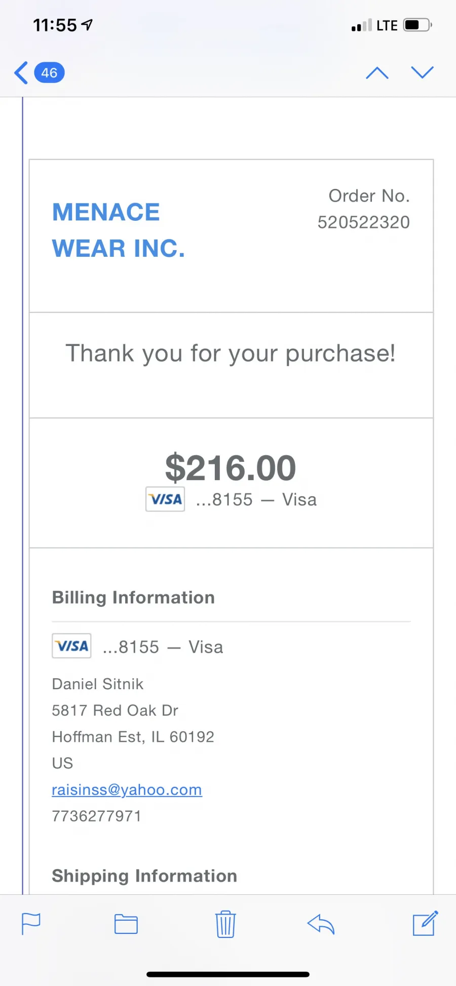 Review: Back on August [redacted], and order was placed with Menace Wear, Inc for several uniform parts. After numerous attempts to receive the proper uniform parts, as of this date I am still missing several. I had paid in full back at the end of August. The check was cashed. We as an association have received three separate shipments, none of which contained my parts that are still missing. I was told they were shipped and arrived on more than one occasion. I ordered them and paid for them as an individual. I was trying to understand shipping costs and not demand I be sent my own order, but my order is still not complete! Items ordered by another team in the association ordered items two weeks ago and those items were received. Mine are still not here!!!!Desired Settlement: I would like to see the order delivered within the week. My boys and coach have been waiting since August for our order. Most of the team has their items. I want the rest of mine in a timely order.