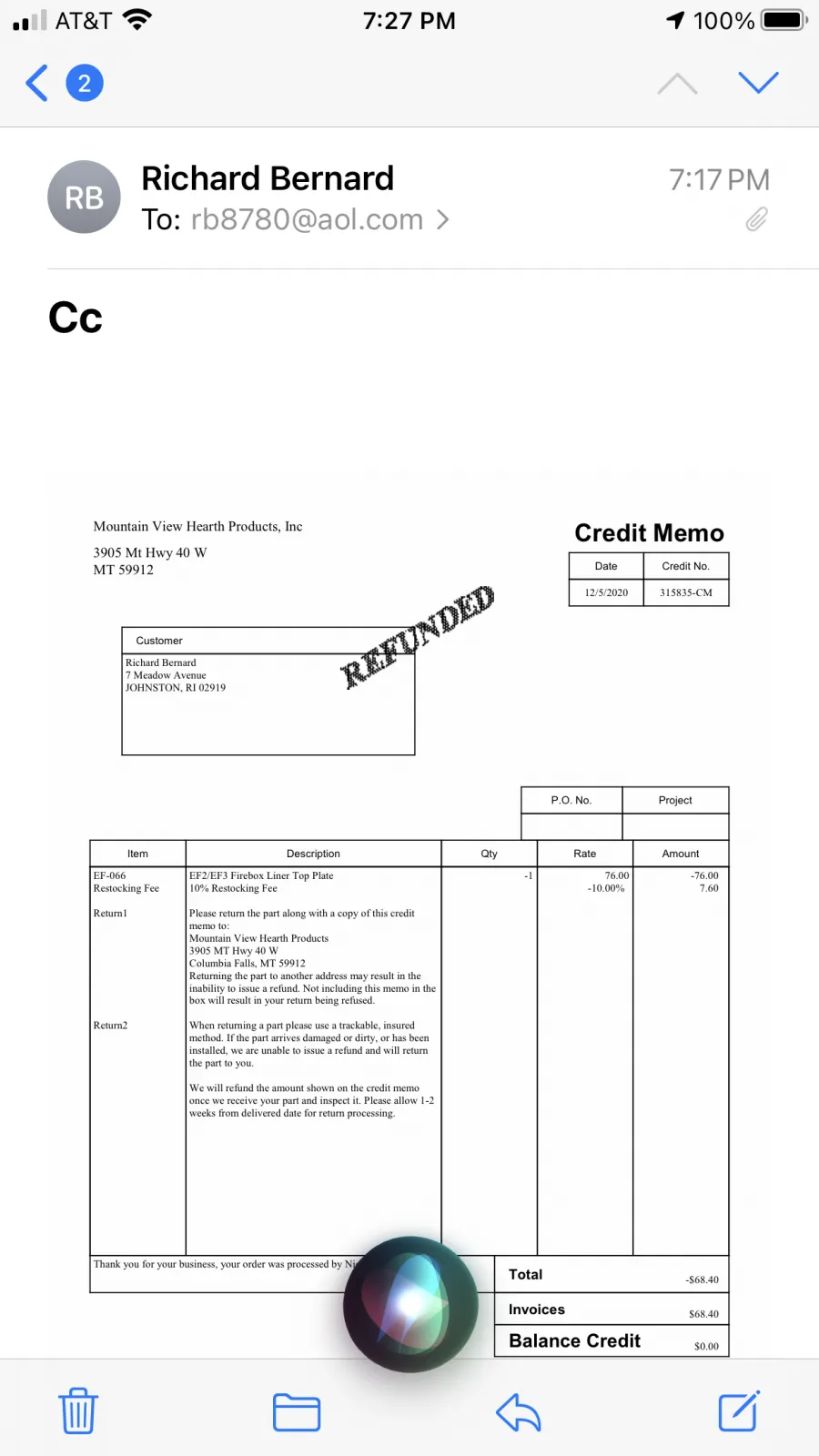 Complaint: [redacted] I am rejecting this response because: MOUNTAIN VIEW PRODUCTS DID NOT FULLY REFUND THE ENTIRE AMOUNT OF $279.60 AS PER EMAIL AND OVER THE PHONE CONVERSATIONS. I HAVE ALSO NOTIFIED THE CREDIT CARD COMPANY OF THIS PROBLEM. THIS COMPANY IS GIVING OUT WRONG INFORMATION REGARDING ENVIRO EF5 JUST TO RETAIN THE RESTOCKING FEE OF $55.92. I COPIED AND PASTED ONE OF THE EMAILS SENT TO ME: DEC 27, 2016 | 03:32PM MSTAaron H [redacted] replied: Hello Ma’am, I was informed that Enviro has updated the stove and the blower inside the stove, the wires in the stove are now male and the wires on the blower are female. This is reversed in your older model, in which the wires in the stove are female and the connectors on the blower motor are male. There are no blowers with male connectors being made any longer at this time, Enviro only sells the kind with female connectors, as confirmed when you called Angela earlier today. You will have to switch the wires in the stove, by clipping the female connectors off and crimping male connectors on instead. There is no other option for a blower replacement since the part is no longer manufactured with male connectors. Thank you for your time. ON 12/27/16, I EMAILED STATING THE FOLLOWING: 1. This company should notify consumers of these changes if this is the case on their website. THERE IS NO PICTURE OF THE CONNECTOR ENDINGS ON THEIR WEBSITE ! 2. This company should follow through with sending adapters to consumers as promised over the cell phone conversation *Supervisor involved 3. If company is unable to send adaptive cables as promised, consumer should be allowed to return defective convection blower for a complete 100% refund SO I AM STILL WAITING FOR THE REFUND OF $55.92 [redacted]