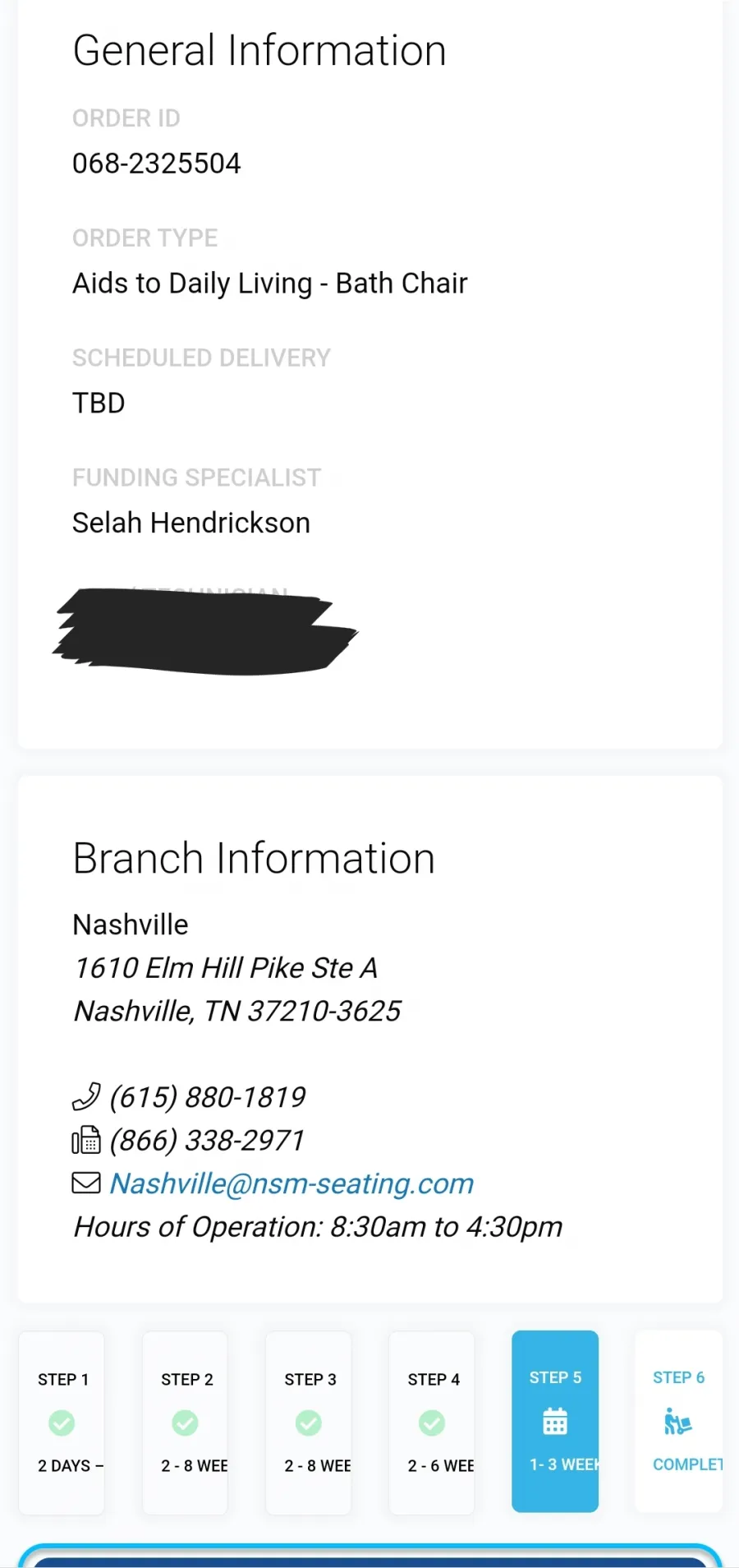 therapist. If it seems we’ve fallen short of that mission in the case of Ms. [redacted] and her daughter, I do apologize. NSM evaluated the need for repairs on April 7, 2016. At this time, the technician determined new batteries were in order. NSM has confirmed that the batteries are not covered under warranty and payment was accepted on April 11, 2016. On April 12, 2016 NSM scheduled delivery for the next day. Unfortunately, NSM was notified that the client was not available at this time after all. Final delivery of the batteries has been scheduled for April 18, 2016. NSM has contracts with some insurance companies that do prevent NSM from completing self-pay orders. This question has since been clarified, payment was accepted, and the client will directly bill her insurance. NSM considers this concern this concern to be resolved. If this is not the case or delivery does not go as planned on April 18, 2016, please contact me at [redacted] or [redacted] Respectfully, [redacted] Compliance Specialist National Seating & Mobility.