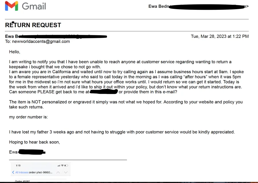 On Wed 3/15/23 I ordered a keepsake (114.99) from them with Next Day Air service ( $78.00), never got the urn on time. UPS "UPS Next Day Air® offers guaranteed overnight service for time-sensitive shipments". I called and I was told by the "supervisor", that processing time is not one day and it's NOT guaranteed to arrive by when I needed it (3/18/23-my father's cremation burial). I informed her their information about processing and shipping on the website was misleading. She asked me bluntly if I want to cancel the order then. I did not because I wanted to see if the urn comes on time-she said they'd try to ship it out ASAP. The urn came super late-Tuesday 3/21/23. I looked up their return policy which in short said refunds were ok if sent out within a week and to call for more info. So I called on Monday 3/27/23 (1 day before the week expired, but within my time frame), the business owner (woman) answered. I explained the situation and asked for return instructions and that i'd send it out today. she said "Why? Why do you want to return it?" in a very rude tone. Then she said I'm calling after hours (~3pm in California) and to call tomorrow, hung up. Next day I called-went to VM. Called a few hours later-voice mail. I did this for 2 days, and even wrote an email! Eventually we called from a different phone # to see if she was ignoring my calls on purpose. And guess what -someone answered. A man looked up my order but said he couldn't do anything as his "supervisor" had to approve the return. Supposedly he emailed her and she would call me the next day (Wednesday). I waited with no call all day, so I CALLED again- the guy answered, he was nice but unable to do anything. He apologized, put me on hold and said he'd call her.He said she told him she'd call me tomorrow. It is now Thursday and you can guess she hasn't called. I made my last call and told this gentleman that at this point if she did not call me back today, I would take this matter somewhere else. THEY ALSO lied to the Better Business Bureau in my complaint stating my item was customized and I couldn't return it where I have receipts and photos to prove it was not!