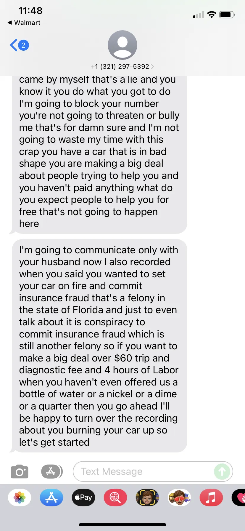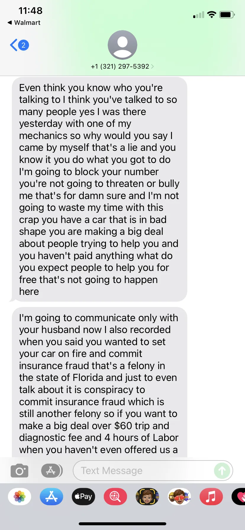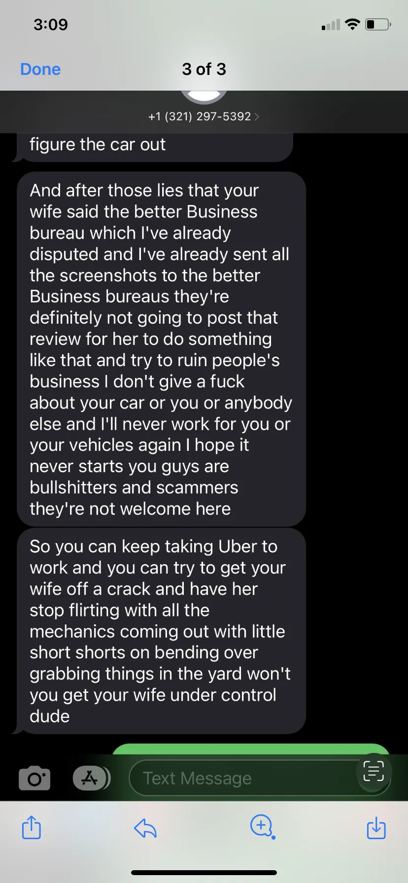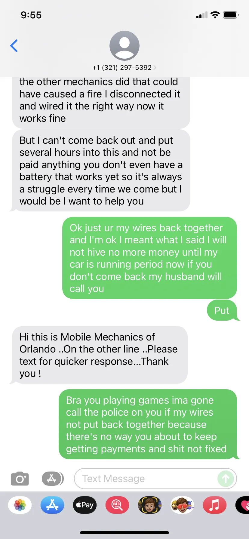 The repair company came out on Monday July 13th around 11am to perform a new car assessment. I was told that I had to have my spark plugs replaced and that one of engine coils needed to be replaced. They said that I needed front and back brakes and a coolant flush. On the 13th, they replaced the spark plugs, and the front brakes. The technician Chris stated he needed a part, left and did not return. I paid $550 on this day. When I got into my car, I saw that there were lights on that were not there before they arrived. I called them back and spoke to the Tom the owner, the owner apologized and sent out a technician the same day. When the he returned he had to reconnected a wire to make my service light go off. I asked him for the brake pads that was changed out, he told me that he'd thrown then away. I texted Tom and he made the technician go and retrieved them and sent a picture stating these were the old brakes. Tom then stated that he would take care of back brakes. I texted on Tuesday July 14th to ask when service would be performed. Tom responded back asking what time I would be available on Wednesday July 15th. I advised him in the morning, his only was response was okay. I texted him around 10:15am and he stated that the technician Chris advised him that the wheel barings were bad and would I like to add that service. I stated if it was necessary then yes. He advised me that he would let me know the price as he was on his way to O'Reilly auto store. He arrived around 11:30. They performed service on my back brakes. Tom left his technician stating that he was leaving to grab additional parts. Tom never returned. The technician performed tasks. The technician Chris completed work around 2:10pm. We take a test drive however I stated to Chris that the car was not riding the same. Chris stated that Tom had purchased the wrong part and that Tom would reach back out to me. I inquired as to why the incorrect part was installed on my car. At this point my ABS light is on and I am unable to move my car without the traction control being turned off. I reached to Tom regarding these issues. He has no longer responded to any of calls or texts. I called from another number to reach him and was able to speak to him. During this call, he hung up and then proceeded to text and threaten to block my number if I continued to reach out.