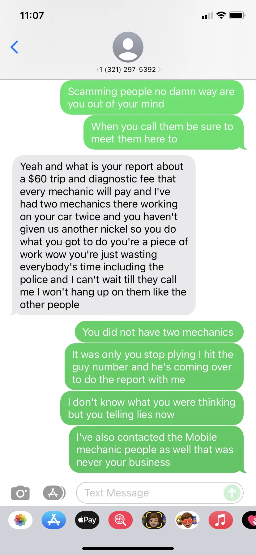 This mobile mechanic never completes my job with pay he just took $2,880 of my money and disappeared I can't locate him. And he won't answer any of my calls he just text and gives me false dates that he will return. I am in the process of filing a law suite on him.