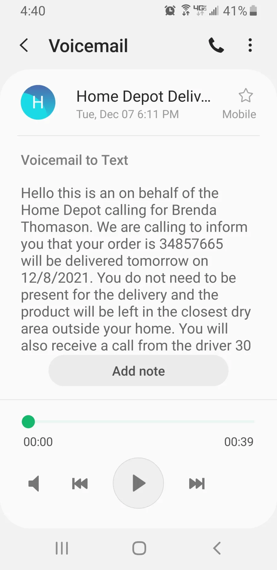 Day 2, just never came, day 3 claimed I refused it. After four days of complete dishonesty I called HD for help. They acknowledged NDS was not being truthful. They offered to send another delivery company to go pick it up and deliver.