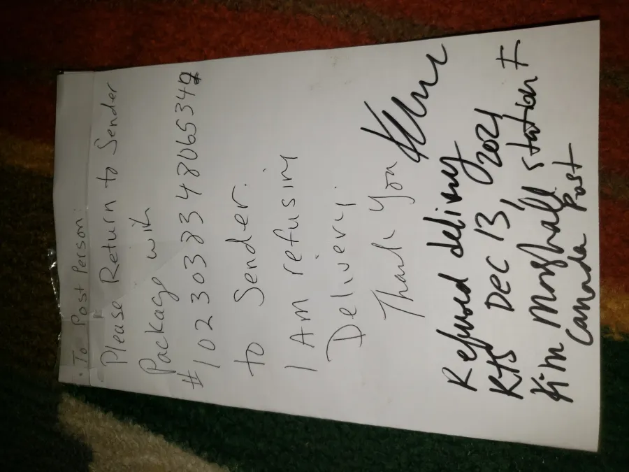 I left a note and the mail woman was kind enough to write her info on it. She also emailed me the notice of refused package sent back to probably china.
