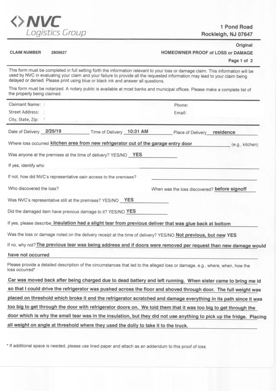 customer is responsible for signing the document in front of a Notary Public, providing pictures of the claimed damage(s), providing statements/story in regards to how and when the damage was seen, whether or not the damage was noted on the delivery receipt, and providing an estimate, bill or any other amount to determine the amount the customer is claimingAll damages, whether to the actual item being delivered or property damage, is to be noted on this receiptThe customer signed off stating there were no damagesCustomer states in the claim document that he noted the damages after the delivery team leftOn 3/16/15, NVC was in receipt of these documentsDuring this time, from 12/29/until 3/16/15, the customer did not contact us in any way regarding his claimTo date, there has been no communication between NordicTrack and NVC in regards to this claimThe first and second letters from Revdex.com did not come through and we were unaware of this being brought to Revdex.com’s attentionThe letter dated March 2, was the first time we were aware of anything going on with this customerIn regards to the return of the NordicTrack, our office started the process of this return as of mid-JanuaryThe actual pidate of this item was 2/27/As previously stated, NVC was in receipt of all claim documents as of 3/16/The customer failed to fill out every section of the claim document, which has since been brought to his attention to fill-out and return to NVC