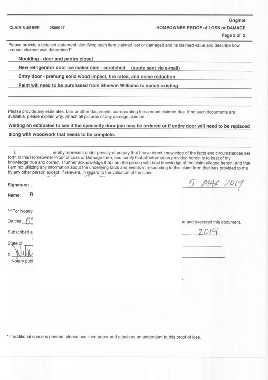 They did eventually send an insurance adjuster out to look at the damage a month ago. He took photos and also took with him our only piece of matching wood stair piece that we had. He never returned it. He then sent a sample by UPS. The wrong color and shape. Then two boxes of wood strips that were not even stair noses or the correct color, which I had verified by a contractor.