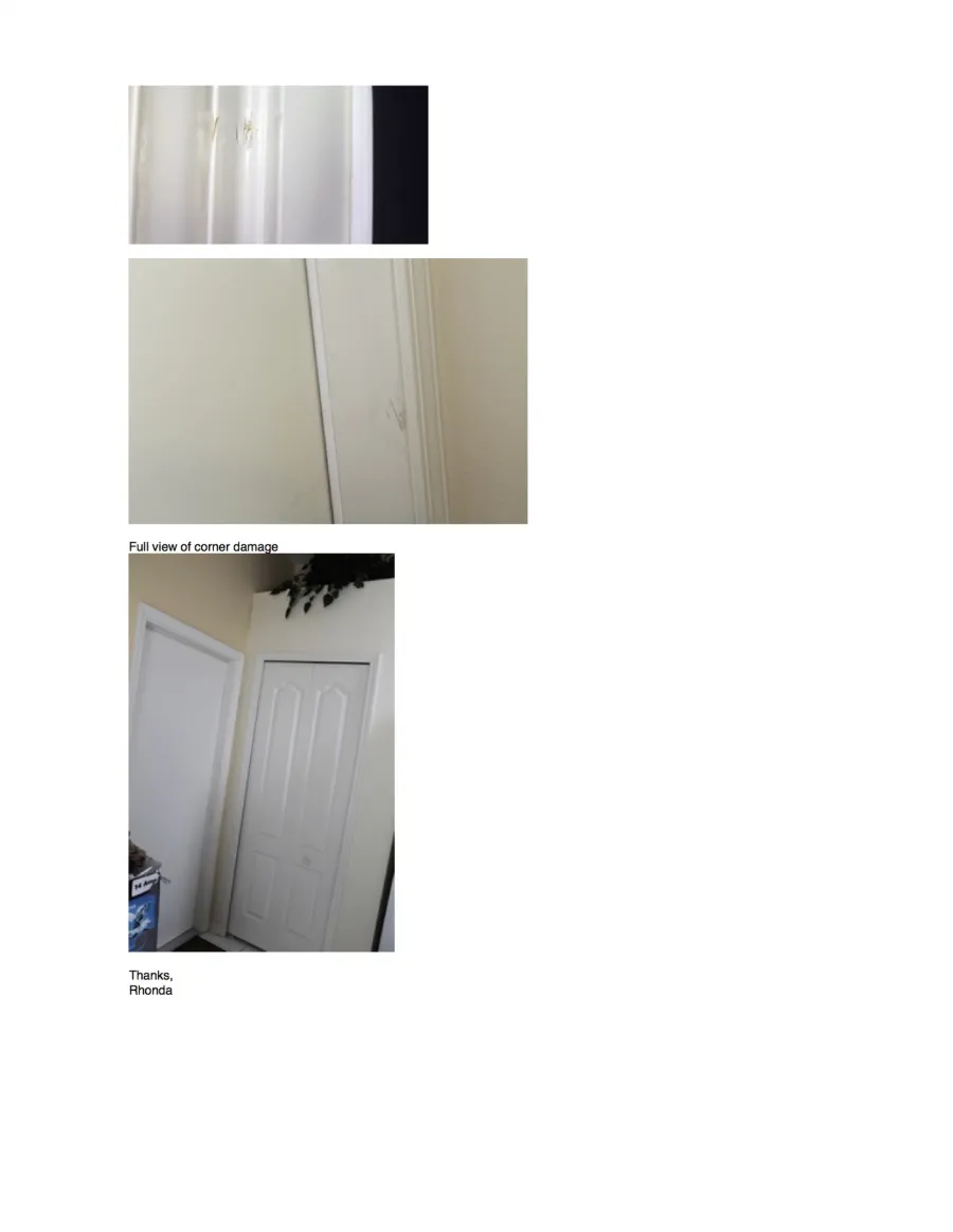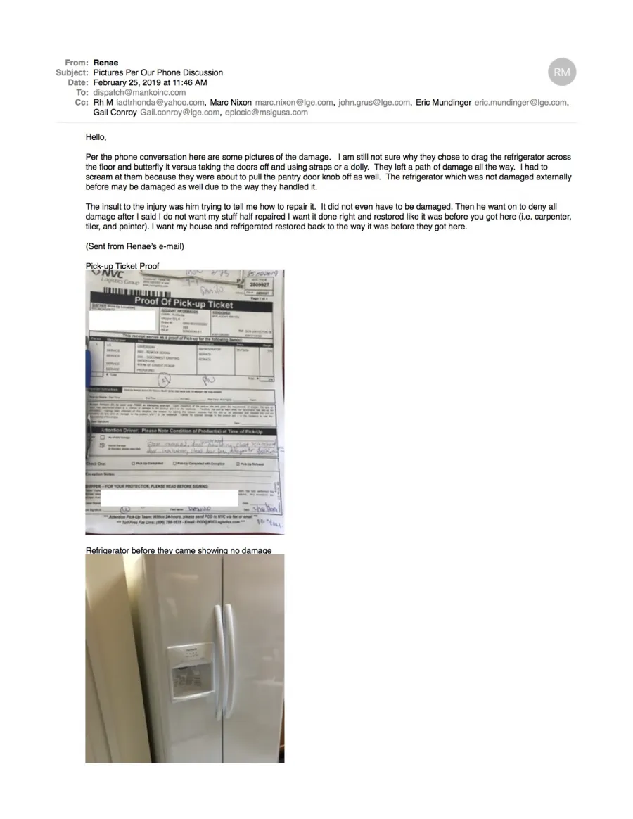 Here are the pictures. It did not like the pdf files of the e-mail sent with the images, which is attached last. The e-mail was sent to Manko Systems and LG after the phone call letting them know about the damage. Later I was told to only deal with NVC.