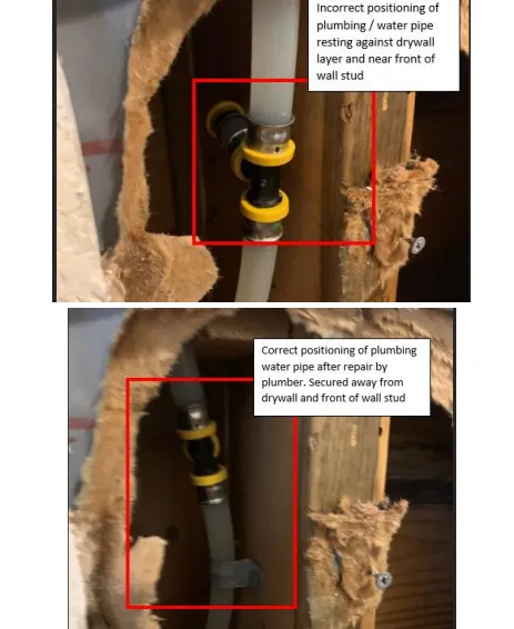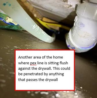The damage occurred when anchoring a 1” screw into a wall stud, something every homeowner should be able to do without fear of hitting plumbing. Unfortunately, Pacesetter’s shoddy craftsmanship allowed the pex line to be “pinned” between the drywall and wall stud and the line immediately shot pressurized hot water into our home. We were lucky that nobody was seriously burned/injured. Multiple people within the profession of homebuilding have seen photos of the pipe placement and provided written testimony of the negligent placement of the pex line. Upon removal of the drywall in the water damaged areas, we found several more places where pex line is not properly secured away from the drywall. I have absolutely no faith in the craftsmanship and reliability of the plumbing and installation of the pre-drywall components conducted by Pacesetter and Dan Schoenfeldt and Jason Cearley (project managers)