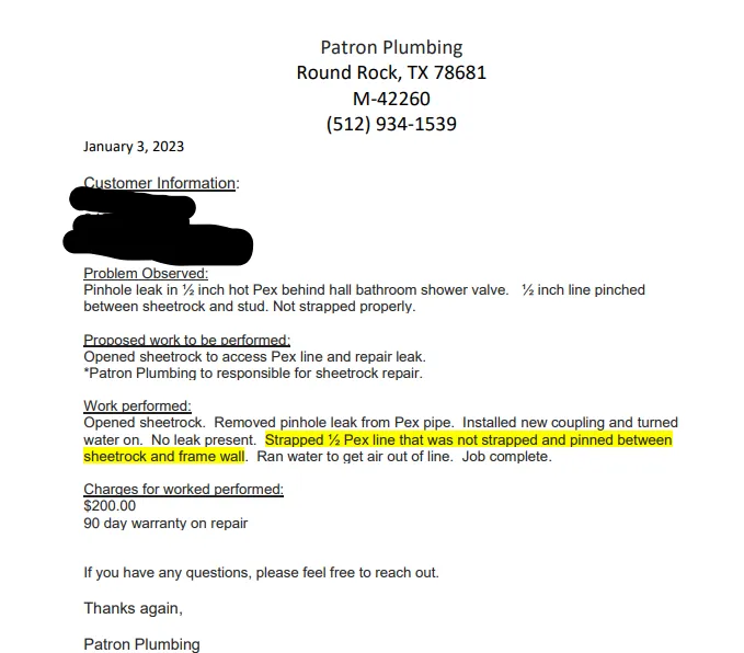 Over a week after the damage occurred, Pacesetter’s construction manager of North Austin, Patrick Durbin came by my home to see the damage. I showed him the damaged pipe and areas of the home where pex line was improperly installed. He adamantly denied any wrongdoing on behalf of Pacesetter and insisted I was just “unlucky”. His visit was entirely unhelpful, slightly insulting, and only wasted time in perusing a resolution.