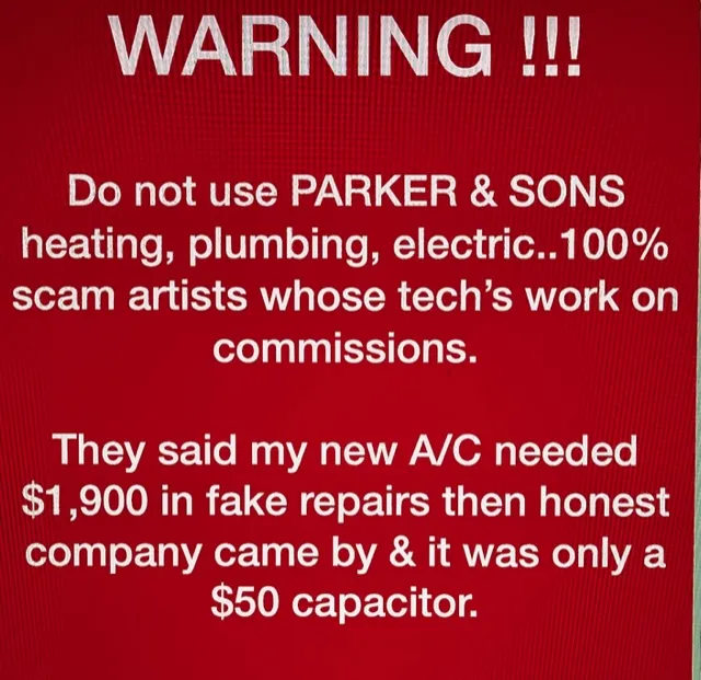 13. Can I say that all āParker & Sonāsā techs would have done this? No. Can I state that every other company out there doesnāt have technicians willing to cut corners and ignore possible cheap solutions to replace your entire system for $20,000? No. Could be all companies have techs that do this, so even getting a second opinion might result in the same result. ERGO: Do your own homework. I spent a whole hour doing research. I saved over $20,000. Thatās a profit I got to keep of over $20,000 an hour. Anybody else making that kind of money, for an hourās worth of research?