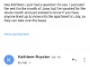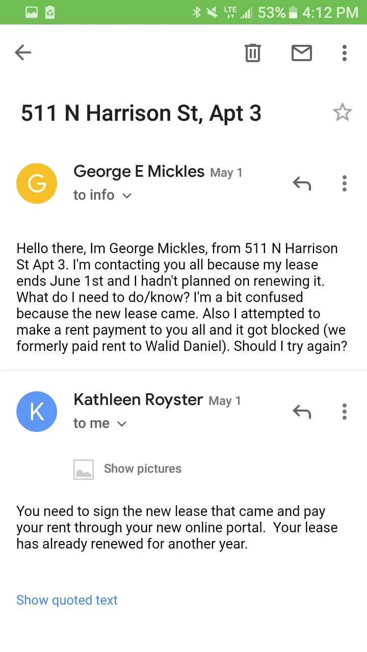 termination letter in order to make sure we have plenty of time to release the property for the Owner and it seems to put a little more urgency in our Tenants to return the necessary paperwork in a timely fashion. All Ms . [redacted] needed to do was call us and let us know she was sending the paperwork to her co-signor and we would have been fine with that. However, she did not. Ms . [redacted]'s lease is scheduled to end July 31, 2016. I contacted Ms . [redacted] via email and she told me that she did have a copy of her lease but that she read it incorrectly. She was very apologetic for that. When a Tenant calls in a work order, such as the mold she refers to in her complaint, that IS giving us permission to enter the unit. When Mike goes to a property he knocks and if there is no answer he will enter. If the Tenant specifies they want to be home, then an appointment is set with them . Ms . [redacted] met with me in my office Wednesday, May 4, 2016 and stated she acted hastily and has asked to extend her lease 2 more months which we gladly did. I feel she is happy with what has been done and feels safe in her home. Please feel free to contact me should you have any questions or need any further information. Regards , Nora K. M[redacted]Residential Property Manager