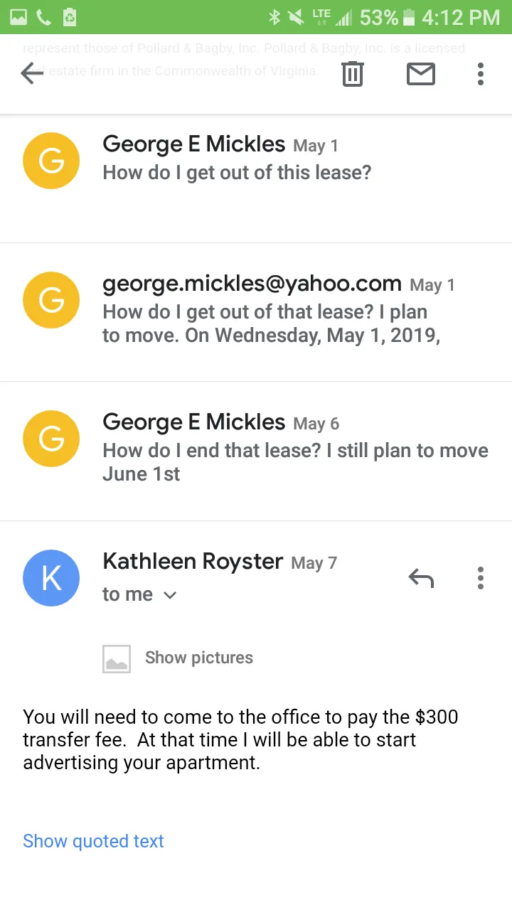 My concern is Walid Daniel and Pollard and Bagby's lack of protection of myself as a lessee. I do not feel safe in my apartment. He has entered my house at lease once without notice. There are dozens of occasions of his maintenance men entering without notice. This too violates my lease. Also I have reported multiple times that there is water damage to the floor and mold growth throughout the apartment as well as writing a letter. There has been no action to identify if this mold is harmful, it has only been wiped away.Desired Settlement: I want Pollard and Bagby to handle my deposit and rental checks until the end of July from this day forth. I do not trust Walid Daniel. I agree to move out the end of July 2016 even though this does violate my lease.