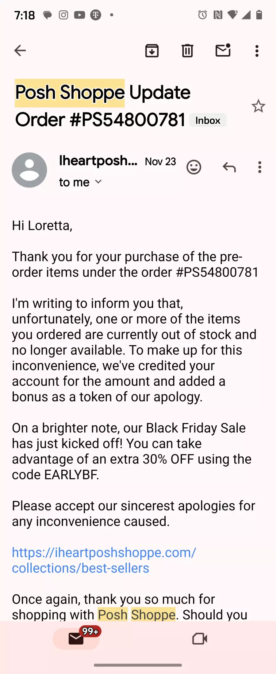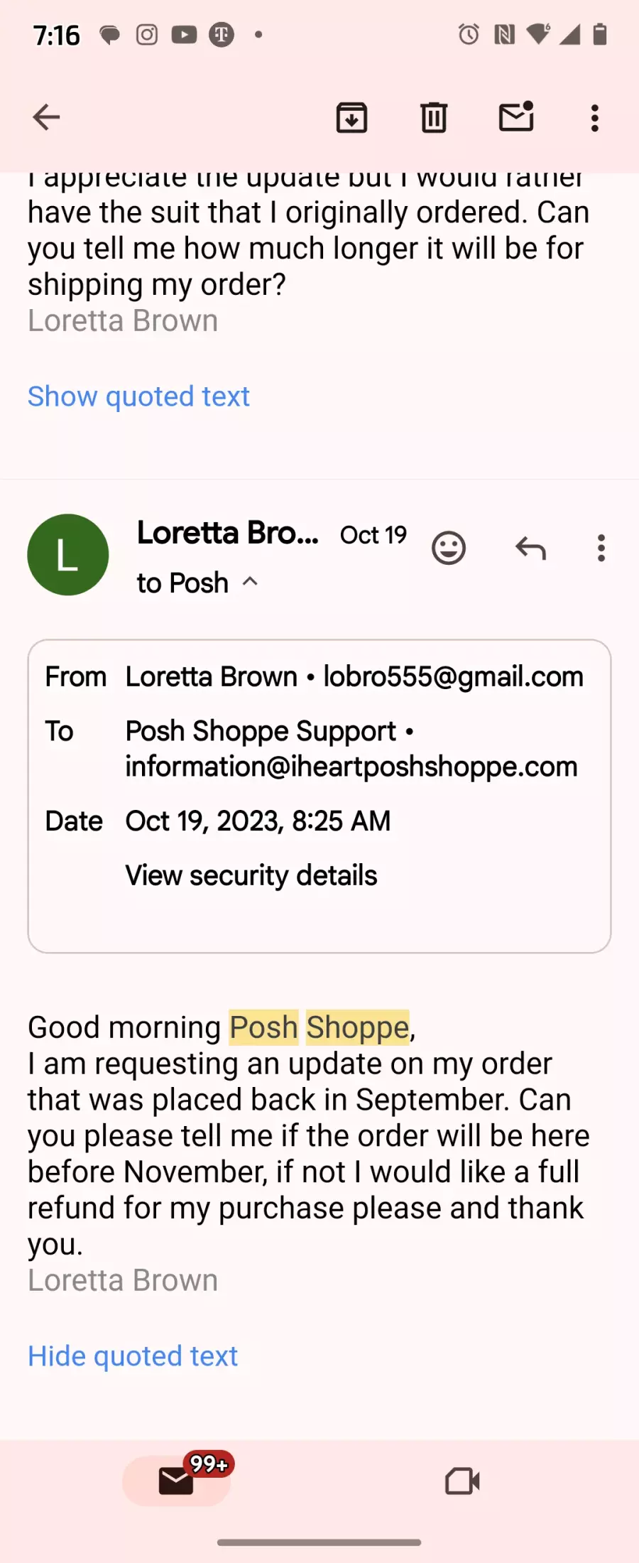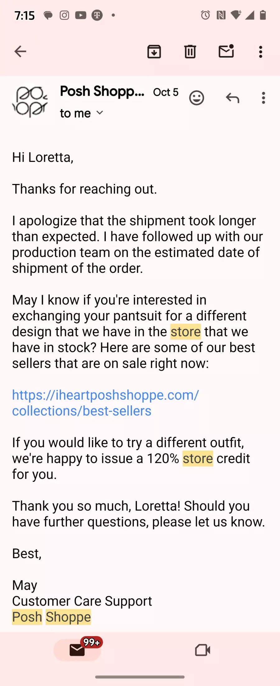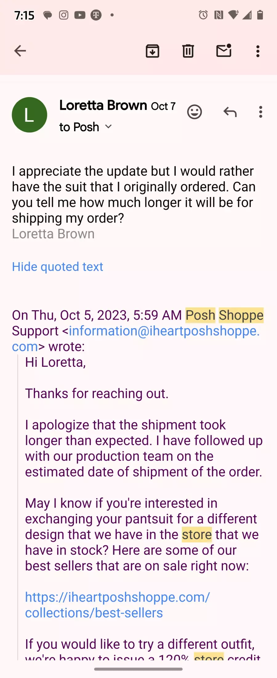 I received an email on October 5,2023 from May @ Posh Shoppe saying that the shipment took longer than expected. They then asked if I would like to exchange my order for another outfit with a 120% store credit. I responded back to Posh Shoppe on October 7,2023 advising them that I would like to suit that I originally ordered asking when would the order be shipped. I sent another email on October 19, 2023 asking if the outfit would be here before November and if not could I get a full refund. I did not hear anything else from them until November 23, 2023. Posh Shoppe stated in the email that the item I ordered was no longer in stock. Never mind the fact that I ordered the outfit back in September. So you're telling me that it took 2 months for them to respond and tell me that the item was no longer in stock? Then they offered me a gift card/store credit for $190.00. I have never experienced this kind of unprofessionalism in making an online purchase, this is ridiculous!