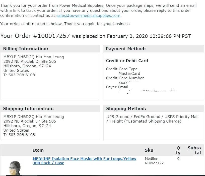 I had major issues with this company and resorted to disputing the charge of masks that the owner said was on back order for 4 months. I tried to cancel through email and by calling but the owner never responded. After disputing the charge, the owner then sent an intimidating/threatening email. Then he charged my credit card again without my permission for what he referred to as a bank fee for me disputing the charge. I disputed that charge, cancelled my card and placed a block on any future charges from Power Medical Supplies. Hope this helps.
