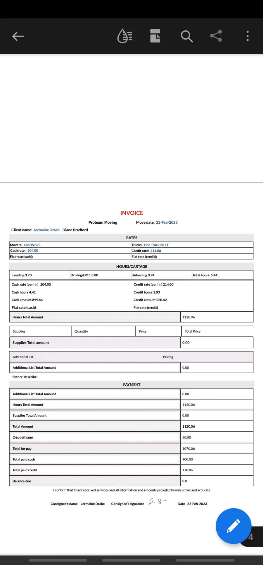 According to my calculation Proteam Moving In, owes me a $220 refund for their unprofessional work, slow work, and inadequate services along with breaking a stair way.