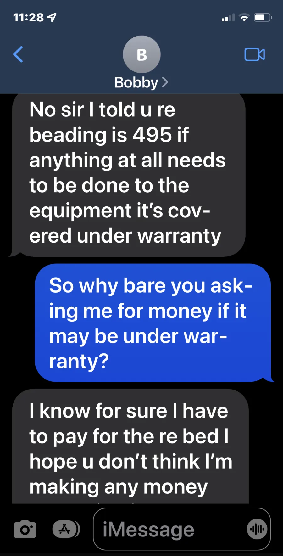 Ok so fast forward another two weeks he’s tells me I’ve got a guy to come and pick up the unit to service at another location and ask me to provide my credit card information to charge me $495. I responded absolutely not. I do not pay for service upfront and I’m definitely not going to text you my credit card information. Big red flag.