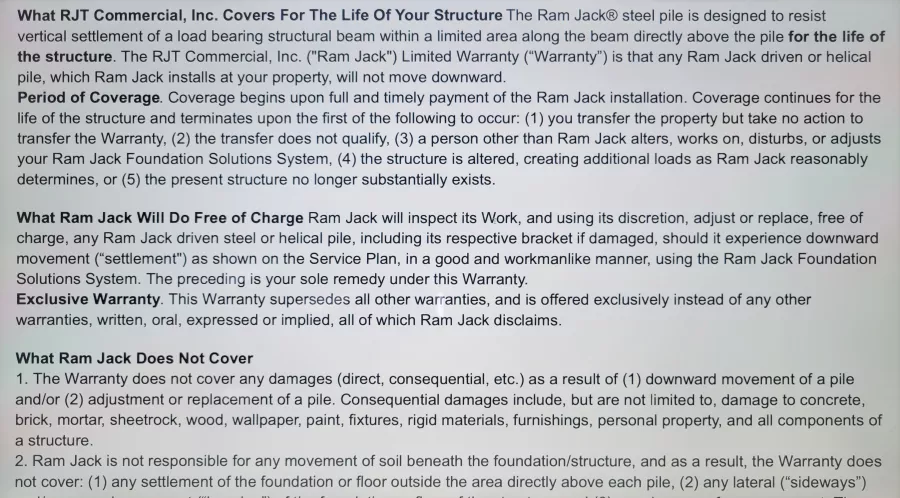 The so-called warranty ONLY warrants against downward movement of Ram Jack Pile - not the foundation where it is installed"; THEN, the same warranty states " Ram Jack will not be responsible for damages caused by the downward movement of the pile?" So, if they warrant the pile will not go downward why would the warranty not cover damages caused by the pile downward movemnent?