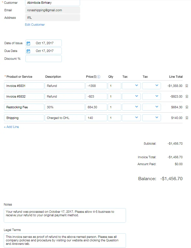 This customer made her first order by invoice with our company on 9/8/Our policy states that all invoices must be paid within hours or they will cancelIf your invoice is cancelled due to non payment you will not be able to invoice again for daysThe customer failed to pay her invoice and it was cancelledShe emailed and called us and begged that we please allow her to reorder her itemsAgainst our better judgement we allowed thisShe made her order on 9/18/and paid on 9/19/She was notified of our processing and shipping times before she placed her orderIt is also included on each invoiceOur policy is All payments take to business days to clear after the payment clears we then begin processing your order and ship with business hoursHer payment cleared on 9/21/and her order was shipped on 9/26/which is within our processing and shipping guidelinesAs stated on our website we are not responsible for customs delays on international packages as we have no control over thisShe confirmed that she received her packageShe order again on 10/9/and paid on 10/10/Her payment cleared on 10/12/Her order was set to ship on 10/17/She sent two messages asking to cancel her order on 10/16/Our policy on our website is also very clear on thisOur policy states if choose to cancel your order after we have begun to process your order a 30% restocking fee will be deducted from your total refundAfter we notified her that her refund would be processed minus our restocking fee, she became irate and began emailing several unbusinesslike emailsWe processed her refund and sent an email confirmation of receiptIn the midst of all of this we noticed that her business had taken several copyrighted images from our website and used them as her own for promotional and sales purposes on her business websiteWe have asked her several times to take the images downShe refused and then threatened our company that if we did not go against our policy and give her a full refund she would make several bad reviews about our companyWe have gone above and beyond for this customer including going against our policy initially to allow her to order, talking to her for hours at a time after business hours because she is in a different country, to make sure she was getting the exact products that she wanted and neededWe have refunded the customer and there is nothing more we can do for her