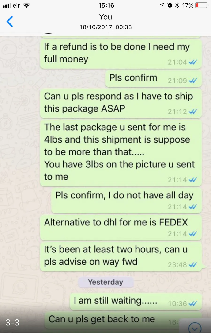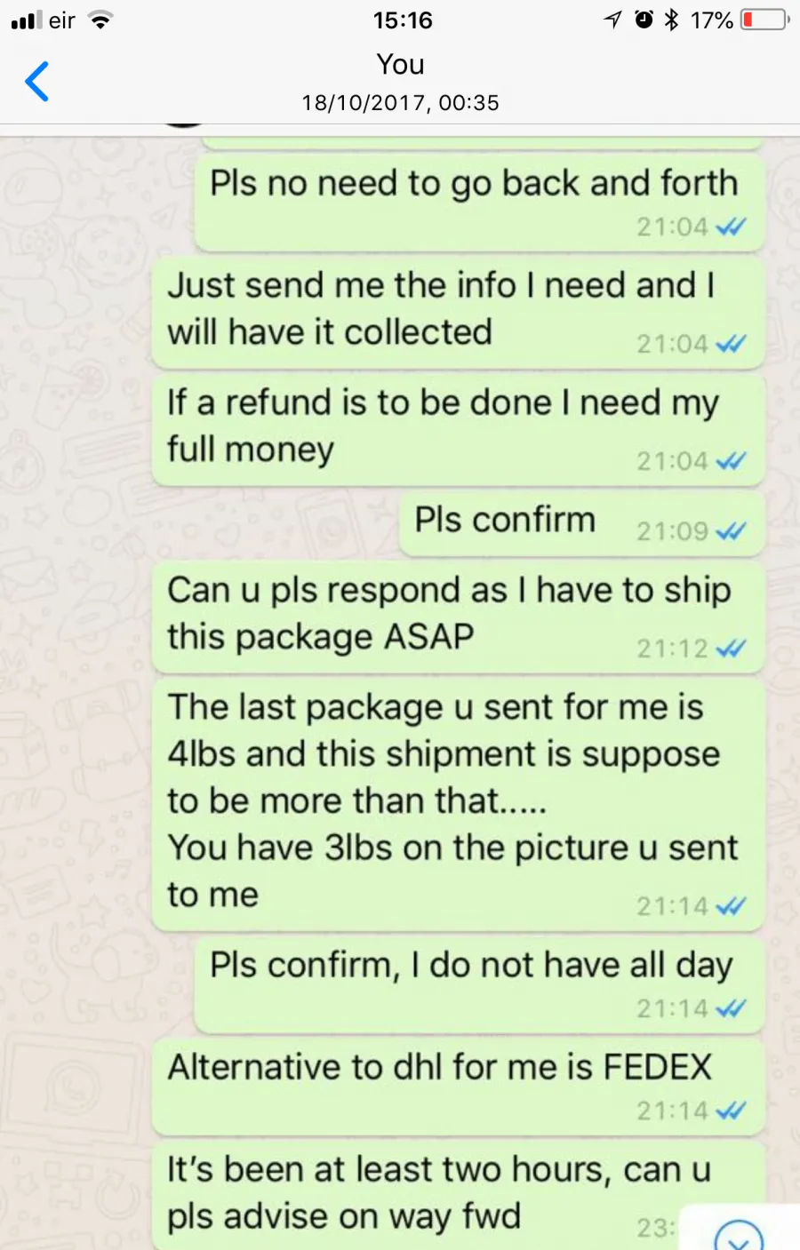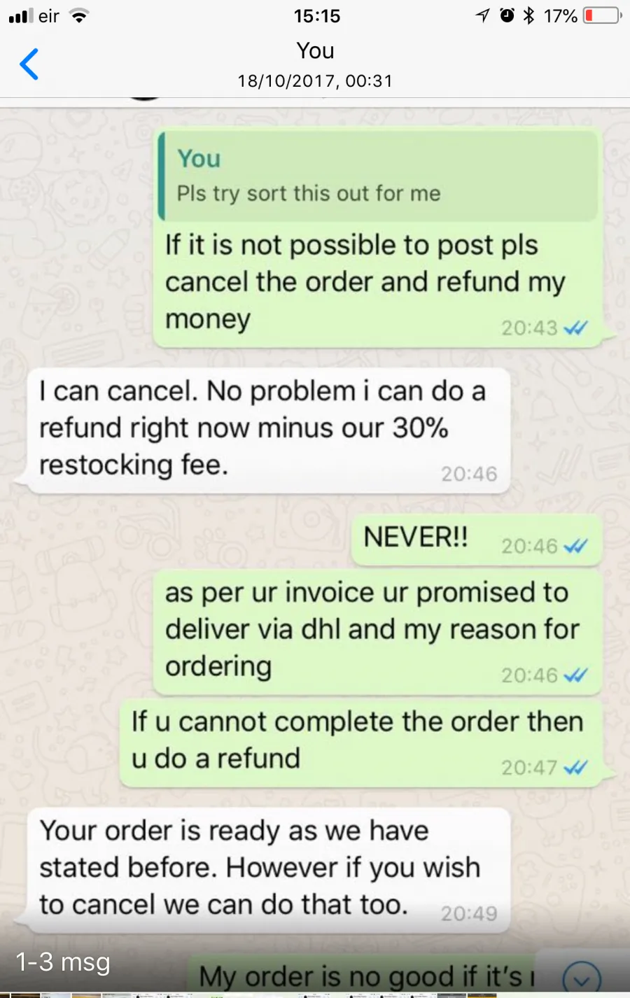 I have attached our conversation before they blocked me from WhatsApp... I NEVER asked for a refund and when I was told a 30% charge applies I told them I do not want a refund. I went further to book a courier to pick up my hair but they refuse to respond to me till date.