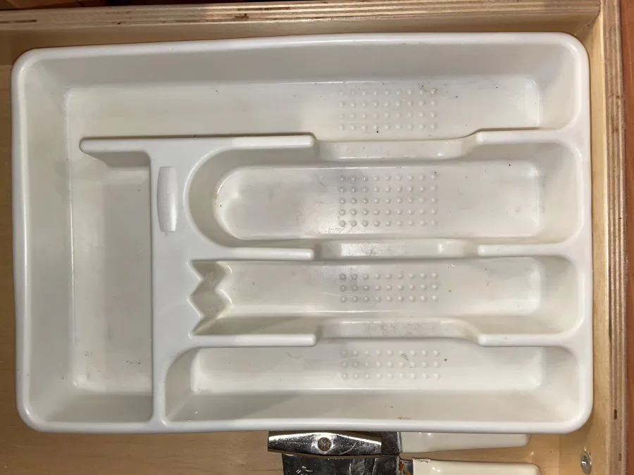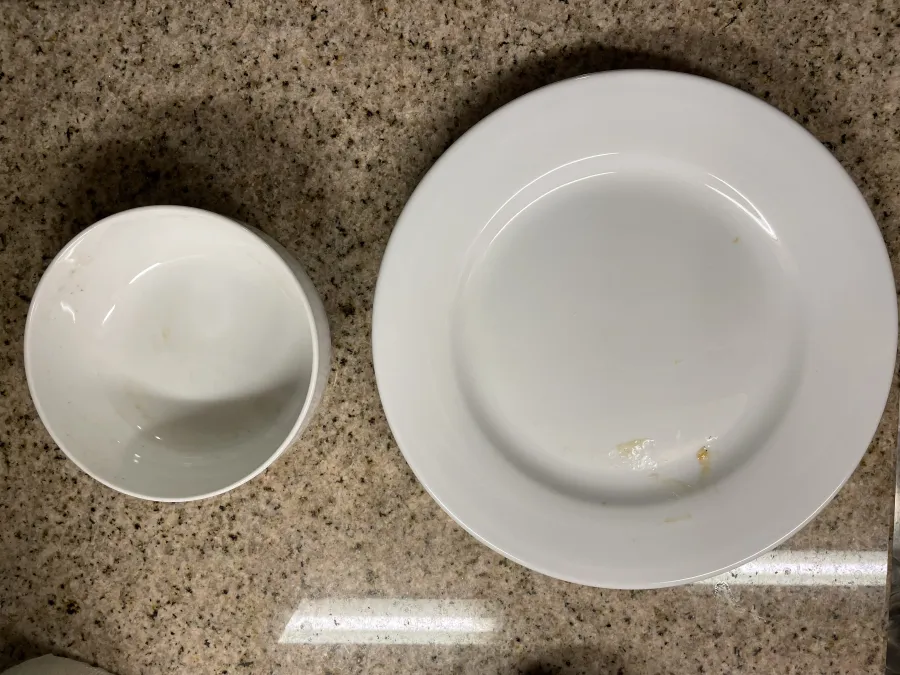 When we looked in the cupboards to see what dishes and cookware were provided, we saw nothing. Then I thought to check the dishwasher, and everything was in there. Several items had dried-on food stuck to them and there was nothing in the kitchen to scrub them with, so one of us went to the front desk and returned with a plastic sponge, which I used to rehash the dirty dishes. When I went to put the silverware away, I saw that the silverware tray was also soiled. The plastic turner was badly blistered from overheating.