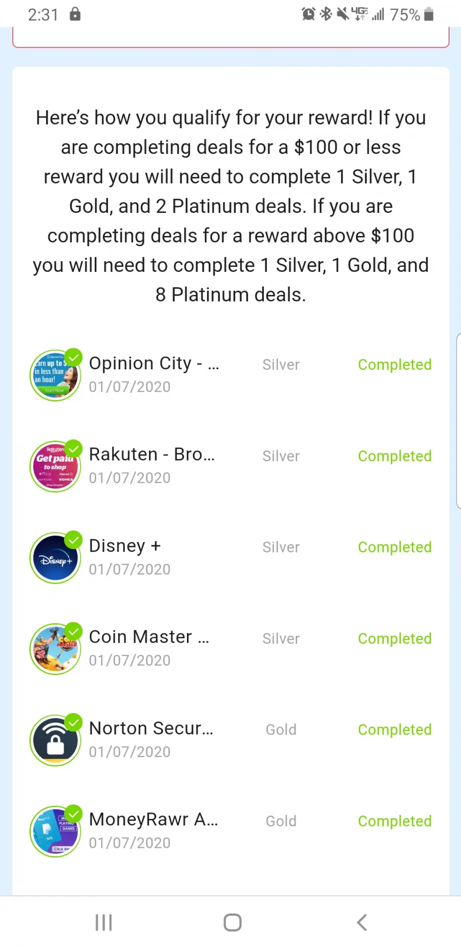 Hi, my name is Nick and I've completed all of my necessary deals - 1 silver, 2 gold, 8 platinum (plus an additional platinum deal) in order to claim my reward, but I have hit a wall after finding out that three of the platinum deals I completed were added as silver deals instead, leaving me at 6 completed platinum deals. I have not submitted a claim yet for the reward for fear that the claim will be denied, but have sent messages to customer service trying to get the deals I completed moved to the platinum category or an assurance that my claim will be fulfilled if submitted. Will gladly change my review and leave positive reviews if the company would work with me on appealing this issue.