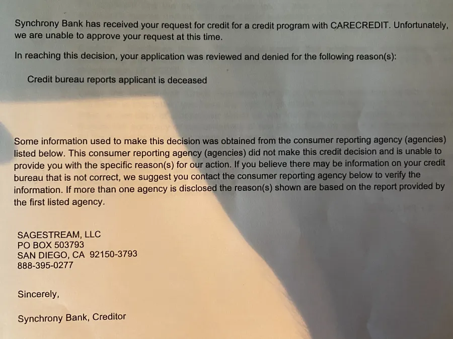 I have a great one I applied for a credit card though Old Navy Visa. Well they said I was deceased, Really . I might have put in the wrong S.S no but they missed up my credit report. They need to check their sources. have 5 credit card and I am not deceased.