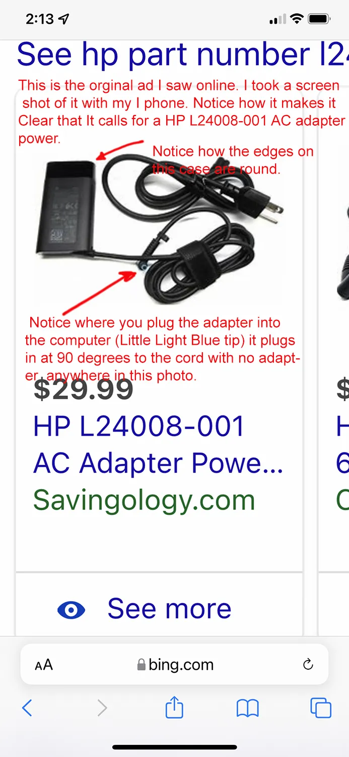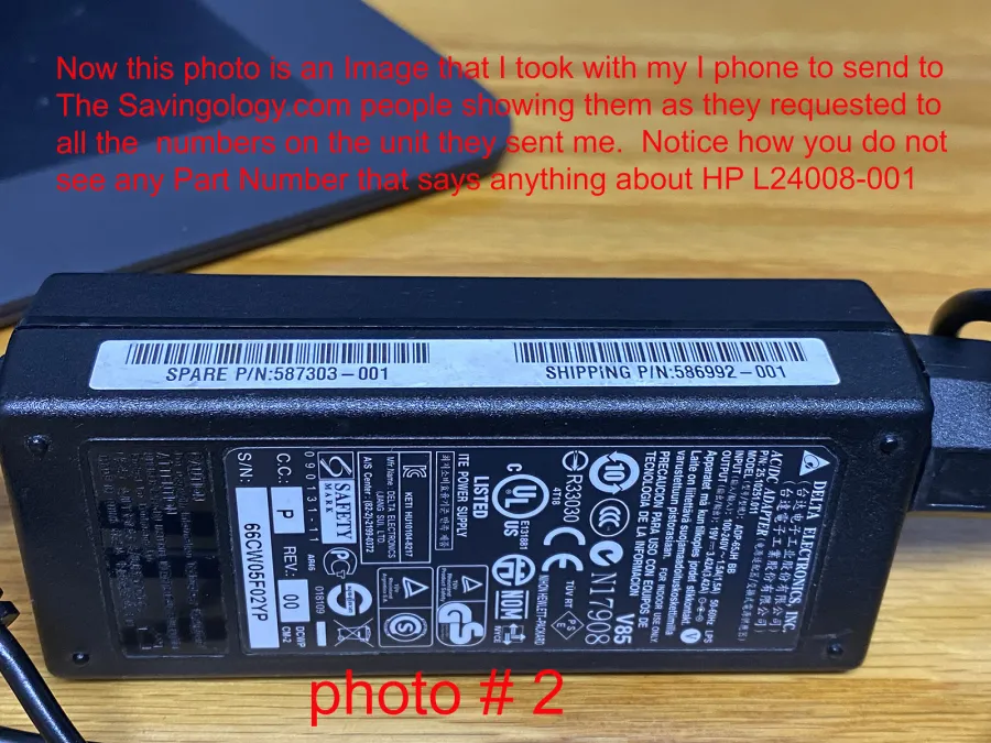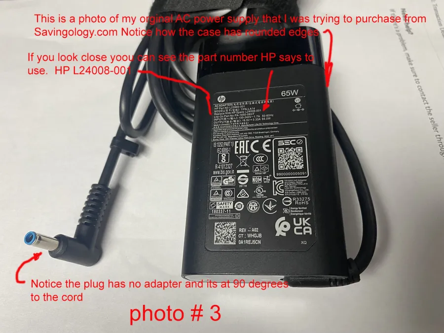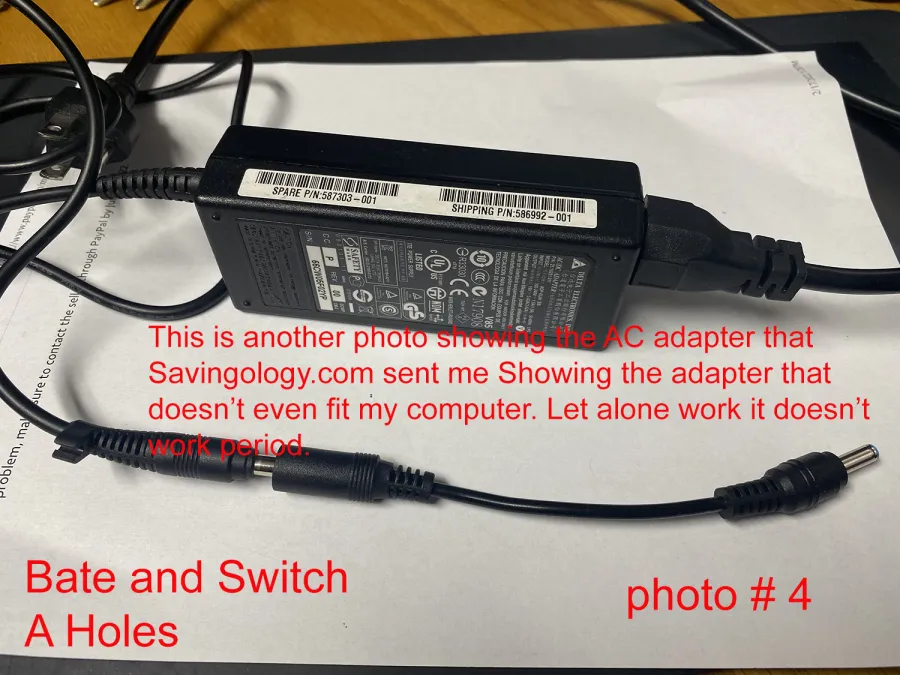 I ordered a power supply for my Laptop. Note in photo number 1 this is there online advertisement Listing the exact model number of my original HP charger. They Show the exact charger in there ad. Then in photo number 2 Savingology.com wanted me to send them a photo of what I got from them I Did. photo number 3 shows my original HP factory Charger. Does that look like the charger in photo number 2? No it doesn't. Scammers. photo number 4 is another photo that I took of the POS that they sent me. Yes all the RED printing in all the photos are Me explaining what these scammers are trying to rip people off for. Don't use them They are a rip off. I would even give these scammers a rating PERIOD