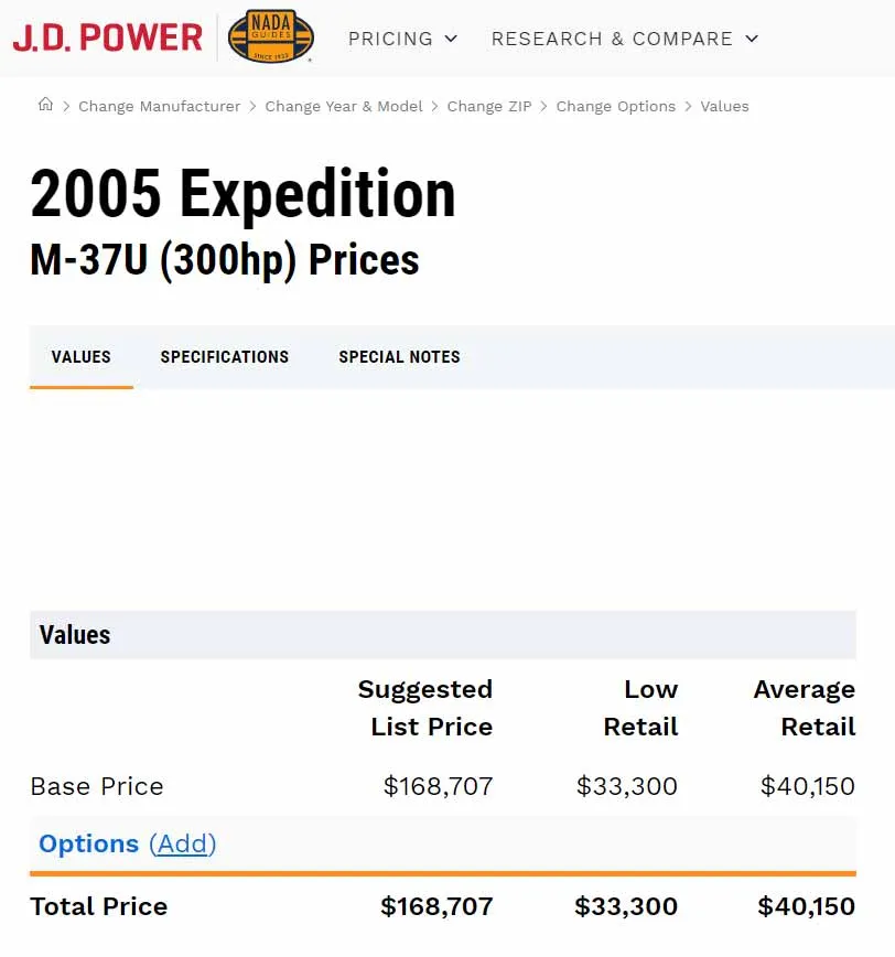 The same 2005 Fleetwood Expedition 37U on eBay with a ‘Buy-It-Now’ price of $46,500 has the *exact* same floor plan, but the paint was green (instead of brown,) the interior was a redwood (instead of pine,) the mileage was 39,000 (instead of 28,000,) the tires, the generator, the electronics, the brakes, the engine – everything was the same… except it was $8,500 less. PLUS, the NADA low book is $33,300 (the average NADA book is $40,150.) AND, a friend who sold RVs for 10+ years (but retired two years ago,) told me that RV dealerships very rarely pay anymore than 10% BELOW the LOW NADA book value (without add-ons!) So they likely paid around $30k for this unit. Of course, I didn’t let on that I had this info.
